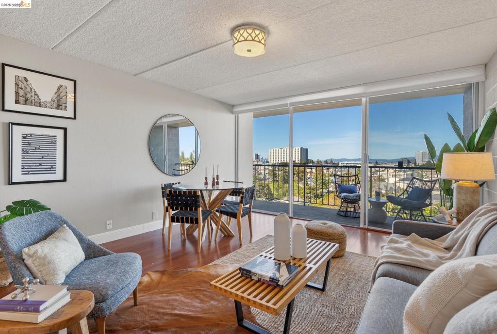 This location is ideal for those seeking to live near Piedmont Avenue, with its restaurants, gourmet grocery stores, coffee houses, boutiques, salons, a first-run movie theater and a famous ice cream parlor. The west facing floor to ceiling glass walls capture the magnificent views of San Francisco, the Golden Gate Bridge and Mount Tamalpais. Wood flooring flows throughout and the bathroom countertop features stunning green glass. The updated kitchen features a granite counter breakfast bar where friends can gather to chat as the host produces sumptuous meals. Outdoors, the balcony runs the full width of the condo and is a perfect place to relax at sunset while nature puts on a show for you and your guests. The transportation options abound near BART, AC Transit and close to Highway 580. It also includes a secured garage parking space as well as a storage unit. Guest parking is available near the entry. A large, light and airy laundry facility with a multitude of washers and dryers, makes doing the laundry pleasurable. Entertain large parties in the separate facility at the front of the building. Kelton Court is a quiet cul-de-sac, and unit 2D could be your primary home, or your pied-à-terre. Views: Downtown