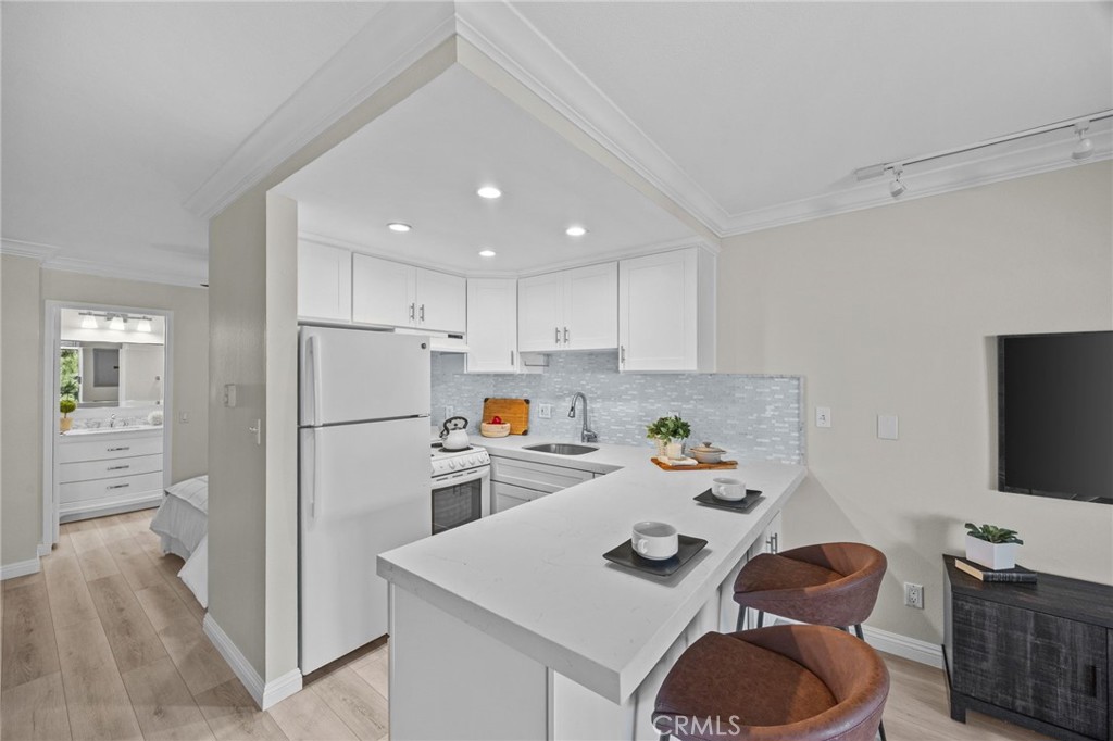 Beautifully redesigned studio unit at Versailles in Newport Beach. This bedroom setup is a studio, with an alcove area for the bedroom. Feels more like a junior 1-bedroom with some distance and separation between the living area and the bedroom. Perfect for one or two people to enjoy, or as a second home for a beach getaway in Newport Beach. This PENTHOUSE condo is on the top floor with no one above. The INTERIOR LOCATION is one of the best locations in the entire community, with no street noise from any of the surrounding streets. Completely remodeled condo with quartz countertops, shaker cabinets, custom tile backsplash, luxury vinyl plank flooring, remodeled bathroom, recessed lighting, and a ceiling fan above the bedroom area. Two full closet spaces with ample storage. This entire home feels light, bright, and open. From the balcony, you will love the views of the courtyard with a fountain, grass, and trees. Enjoy the convenience of the assigned parking space in the underground gated parking garage (space #11). ***HUGE BONUS: There is a 220V electric vehicle charger at the assigned parking space that will be included with the sale! Additional guest parking can be found on the ground level directly in front of the condo. Enjoy the amenities that the Versailles community has to offer: gated community, brand new pool & spa, clubhouse, gym, BBQ, tennis, and a short half-mile walk or bike ride to the beach. Feel secure with the private and locked entry doors into the main building. Walk to Lido Village, Newport Pier, and the world-famous Newport Beach Boardwalk! Just like they always say: Location, location, location!