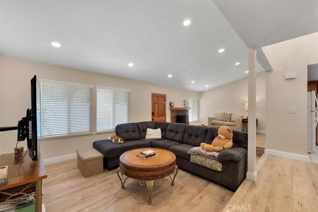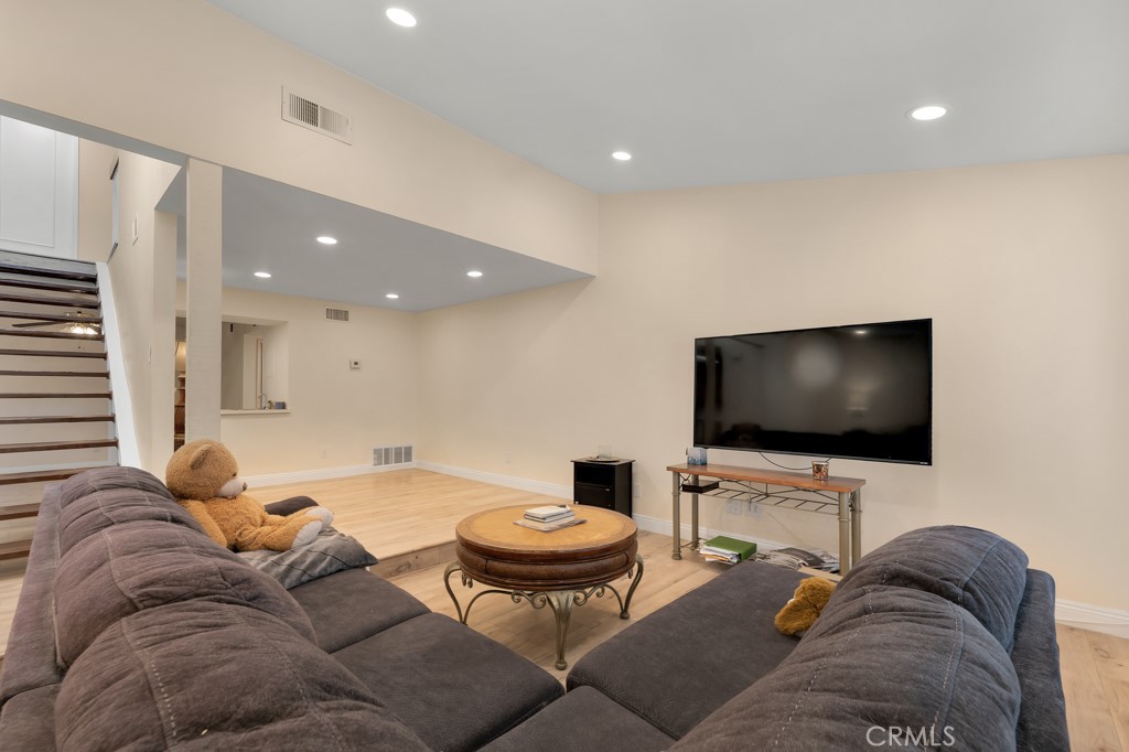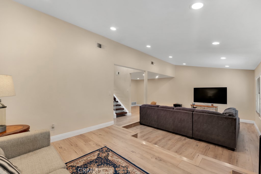Welcome to this beautifully renovated 4 bedroom, 3 bathroom townhouse offering 2,008 sqft of stylish living in the highly desirable Rockpointe Community of Chatsworth. Thoughtfully updated, the home features luxury laminate flooring, recessed lighting, dual-pane windows, updated bathrooms, and even a finished garage. Step inside to an inviting open floor plan where the bright split-level living room impresses with soaring vaulted ceilings, a cozy fireplace, and abundant natural light. Just a few steps up, the dining room with a wet bar makes entertaining seamless, while the centrally located kitchen provides plenty of cabinet space, a center island, all appliances, and a hanging pot rack. A comfortable family room and nearby half bath offer the perfect space for more intimate gatherings. Upstairs, the spacious primary suite includes a new custom walk-in closet with built-in drawers and cabinets, and an updated ensuite featuring new tile flooring, a modern walk-in shower, and a new toilet. Three additional guest bedrooms with ceiling fans and generous closets share a refreshed bathroom complete with a new dual vanity, new tile flooring, a new toilet, and updated shower features. Outdoor living is equally appealing with a welcoming front patio and a trellis-covered back patio—perfect for dining al fresco or creating your own outdoor retreat. Set across 92 acres with over 3,000 mature trees, Rockpointe offers a serene setting and resort-style amenities including 4 swimming pools, a clubhouse, kitchen and BBQ facilities, multiple playgrounds, and easy access to Chatsworth Park North & South as well as the hiking trails of Santa Susana State Park.