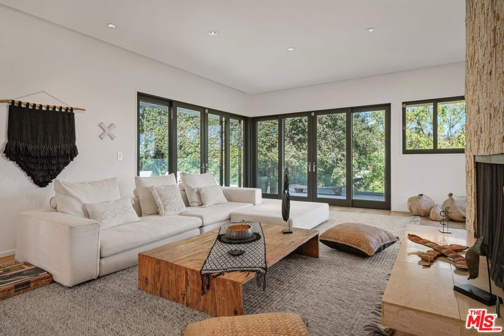 Atop a cul-de-sac street in Beverly Hills Post Oce, this single-level fully furnished and spacious Zen-like contemporary is private abode. Numerouspublic figures have quietly lived here. Interior design elements include furniture and art from Bali, Thailand and South Africa. The layout presents a 2-bed, 3-bath retreat with seamless indoor to outdoor flow and open concept living arrangements. Organic finishes and sliding doors lead you outside to an entertaining haven with Pool and dreamy Cabana. In the kitchen, Viking appliances and wood countertops provide an easy cooking convenience for the pro or novice chef. The primary bedroom features a large walk-in closet and beautifully tiled dual sink bath with a step-down shower. Being surrounded by lush greenery creates a serene enclave while the endless canyon and city views remind you of the close proximity and access to one of the world’s greatest cities. Photos may not reflect current artwork and furnishing.