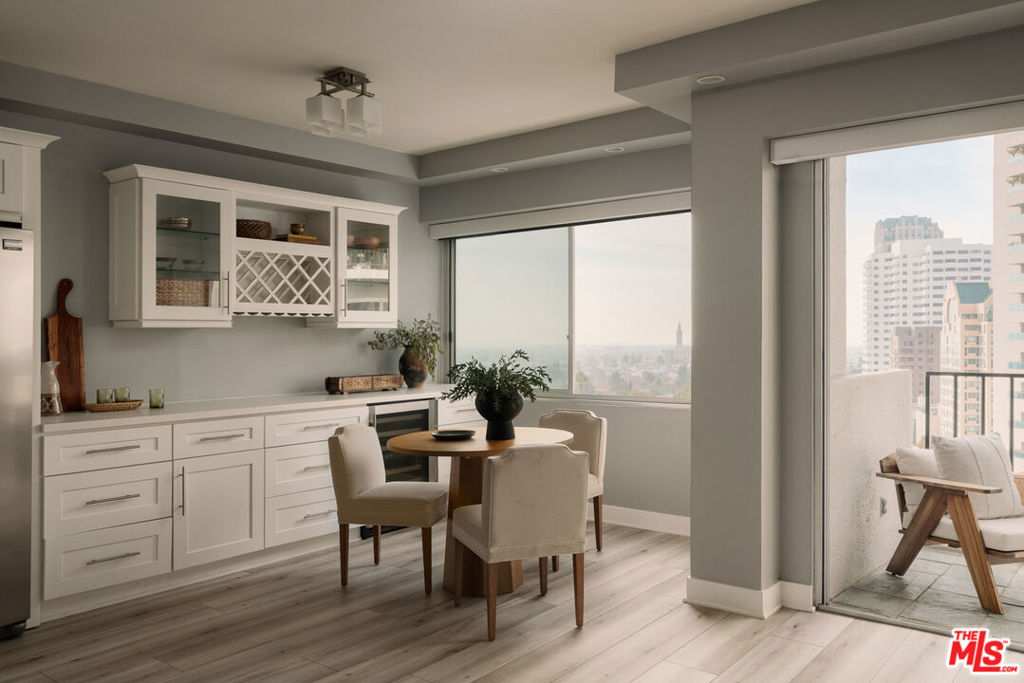 Welcome to The Churchill, a full-service Mid-Century building on the Wilshire Corridor, where this expansive 12th-floor residence enjoys sweeping southwest views and a tranquil rear location. Wake up to remarkable vistas stretching toward the ocean or enjoy dinner on your balcony as the sun sets over the Corridor. This completely remodeled home features one bedroom, one bathroom, and an open-plan living and dining area. The updated and expanded cook’s kitchen includes Caesarstone counters, stainless-steel appliances, in-unit laundry, and additional cabinetry with a wine refrigerator, all opening to a sitting area, dining space, and the main living room. The oversized bedroom offers abundant space for both a desk and a sitting area. The Churchill is a pet-friendly building, welcoming cats and small dogs. Amenities include 24-hour security, valet parking, a fitness center, sauna, recreation room, extra storage, and one of the best pools on the Corridor. HOA dues are $1,281 per month and include all utilities, cable, and building amenities. Centrally located near UCLA and Westwood Village.