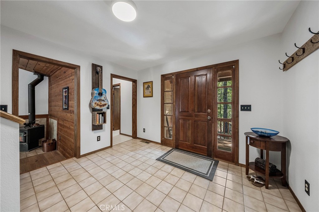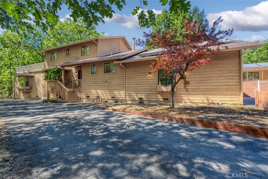 This inviting, custom mountain-style home is situated on almost 2.5 well-maintained acres and offers approximately 3,000 square feet of living space with 3 bedrooms and 4 bathrooms. The property includes two garages, with an oversized detached garage conveniently located next to a lovely in-ground pool and surrounding patios. The home itself boasts rustic character with a boho finish, creating a unique and warm atmosphere. On the main floor, you’ll find a large living room adjacent to a formal dining area that leads to a granite kitchen with a breakfast nook and buffet serving cabinet. The cozy lower family room features a knotty pine vaulted ceiling, a wood stove, and sliding doors that open to the forested backyard. There’s also a ground-floor bedroom with a private bath offering a custom tiled walk-in shower and a convenient coffee bar. Upstairs, there are three additional rooms plus an office. This includes the upper primary bedroom with an en-suite bath and a tiled walk-in shower. A slider door from this room connects to an outside upper deck overlooking the forest below. The Hall Bath offers a tiled tub shower combo. The property comes with two owned solar systems (5.2KW & 2.5KW) and a well producing 20 GPM. This estate provides everything you need to live a peaceful life surrounded by nature. This home truly is a hidden gem once you arrive, you’ll never want to leave this peaceful sanctuary.