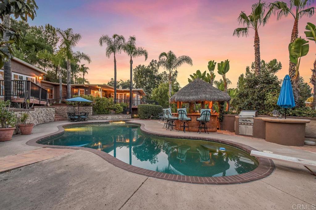 Resort-Style Living on Over an Acre of Private Paradise! Welcome to your dream retreat—a stunning 4-bedroom, 3-bath home offering the perfect blend of luxury and tranquility. Nestled behind a long, gated driveway, this property offers unparalleled privacy and gorgeous views from multiple vantage points throughout the home. Step inside to discover gleaming hardwood floors, a beautifully upgraded kitchen, and remodeled bathrooms that exude modern elegance. The home features two spacious primary suites, each with a walk-in closet, while three of the four bedrooms boast private balconies to take in the serene, panoramic vistas. Outdoors, you’ll find your own tropical oasis, complete with swaying palm trees, a resort-like pool, relaxing hot tub, and a palapa bar ready for entertaining. The expansive lot offers endless possibilities—RV/boat parking, space for gardening, or even creating your own outdoor haven. The family room, complete with a cozy gas fireplace and charming French doors, opens to a massive balcony and sitting area, perfect for relaxing or hosting guests. Recently painted inside and out, this home is turnkey and ready for you to start living your best life. Don’t miss this rare opportunity to own a slice of paradise—schedule your private showing today!