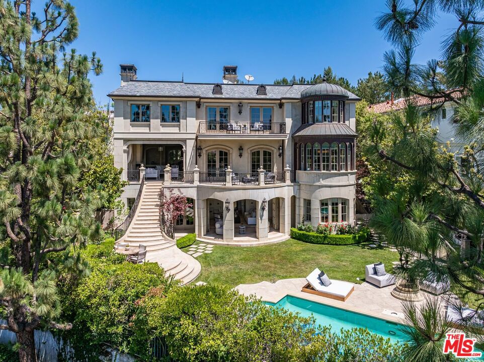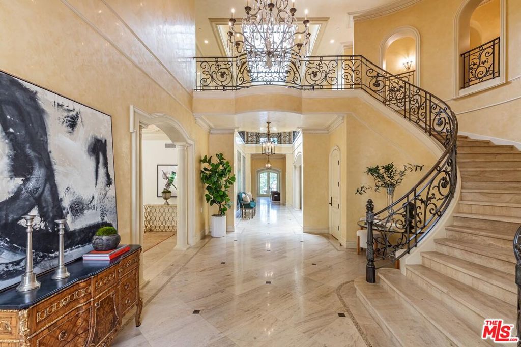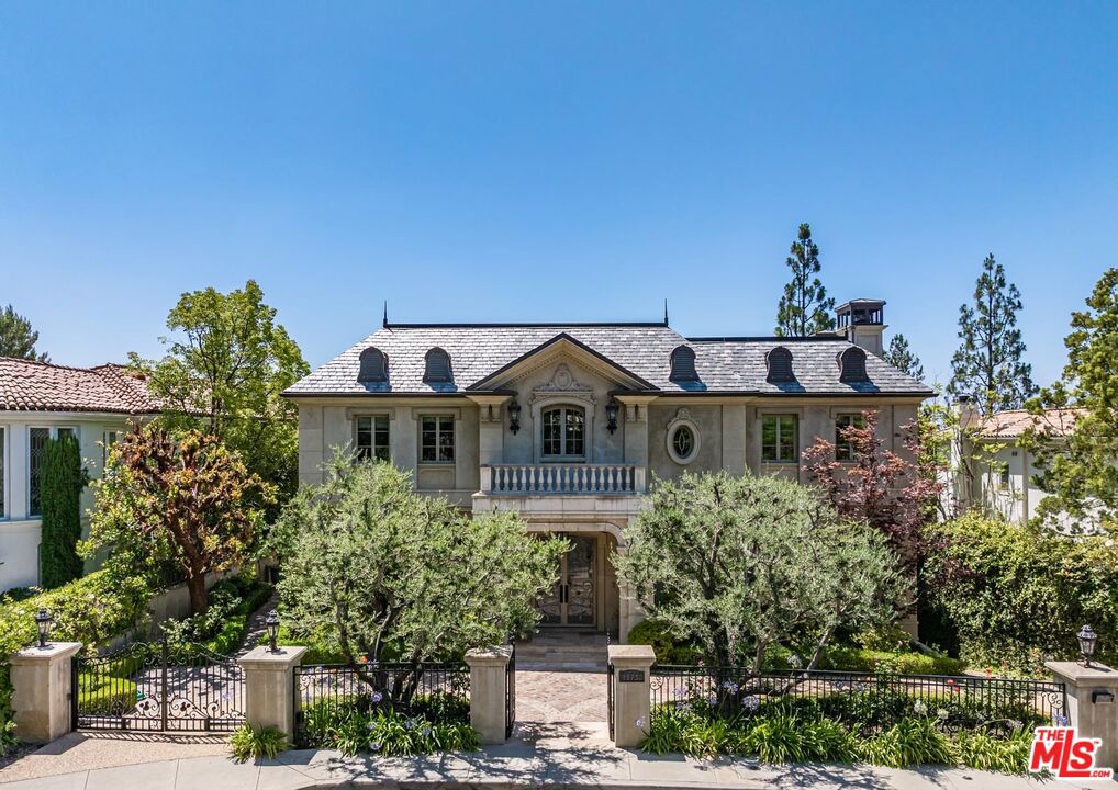 Tucked behind gates in the prestigious enclave of Bel Air Crest, this reimagined French Contemporary estate by Richard Landry is a masterwork of scale, serenity, and architectural refinement. Completed in 2004 and spanning approx. 13,100 square feet, with 7 bedrooms/8 full bathrooms + 2 powder rooms, the residence is a harmonious blend of California light and timeless European elegance. A dramatic double-height foyer with a sweeping staircase, skylight and Crema Marfil limestone floors sets the tone. Venetian plaster walls in sun-washed tones, detailed moldings, crystal chandeliers, and finely milled paneling establish an atmosphere of quiet luxury. Expansive formal spaces include a richly paneled library with fireplace, grand living room, a formal dining room, and sleek bar lounge ideal for entertaining. At the center of the home, a showpiece chef’s kitchen impresses with top-tier appliances, marble counters, a large center island, and a rotunda-style breakfast room framed by curved steel windows. The primary suite offers refined comfort, with a secluded sitting room and fireplace, curved glass reading nook, private terrace, custom walk-in closet and large center island, and dual marble-clad baths with a resort-like feel. Upstairs are three spacious guest suites, each with en-suite baths and walk-in closets and an upstairs laundry room. One features an attached skylit nursery inspired by Korean design. The lower level is dedicated to elevated wellness and relaxation, featuring a mirrored gym with commercial-grade equipment, private sauna, and steam shower all with direct access to the tranquil pool terrace. A state-of-the-art theater, wine vestibule/cellar, two guest/staff suites, pool lounge bedroom with full bath and walk-in closet, and full-service laundry/mudroom complete the level. The four-car garage includes custom storage and a central vacuum. A true extension of the home’s elegance, the outdoor spaces are reminiscent of a private resort featuring a mosaic-tiled pool and spa, manicured hedges, limestone pavers, and mature olive trees surrounding a series of serene terraces. A stone staircase leads to an al fresco pavilion with fire pit and built-in BBQ/kitchen are a perfect for entertaining or quiet retreat. Additional features include an elevator to all levels, smart home technology, double-gated motor court, a hand-made stone facade and located at the end of a secluded cul-de-sac. HOA Amenities: private clubhouse with a fitness center, tennis and basketball courts, putting green, and a resort-style pool and spa. Additional amenities include a playground, dog park, scenic trails, and 24/7 security patrol offering comfort, wellness, and peace of mind. Every detail of this exceptional estate reflects a commitment to timeless luxury, effortless living, and the highest standard of design in one of Bel Air’s most coveted gated communities.