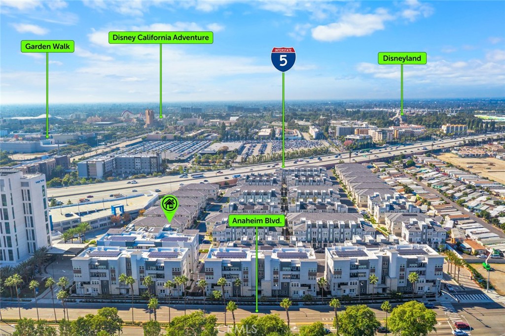 Step into modern California living with this sleek three-story townhouse, perfectly situated in Anaheim’s dynamic new-home community. Built in 2022, this residence offers 2 bedrooms, 2.5 baths, and approximately 1,242 sq. ft. of thoughtfully designed living space. From the moment you arrive, you’ll appreciate the two-car attached garage and gated community access for added comfort and security. The main living level features an open-concept design with upgraded wood-style flooring, abundant natural light, and seamless flow between the living room, dining area, and kitchen. The gourmet kitchen is a true highlight — showcasing quartz countertops, a full tile backsplash, a six-burner gas cooktop, and premium stainless-steel appliances. Step outside to your private second-floor balcony, ideal for morning coffee, evening relaxation, or entertaining with a view of the landscaped courtyard and community spaces. Upstairs, you’ll find two spacious bedrooms, each with its own ensuite bathroom for maximum comfort and privacy. The primary suite impresses with full-height tile surrounds, a walk-in shower, and designer finishes throughout. This newer community adds exceptional value with owned solar panels (no lease!), a resort-style pool and spa, BBQ/picnic areas, and direct access to the Santa Ana River Trail — perfect for biking, jogging, or simply enjoying the outdoors. Location is everything: just minutes from Disneyland Resort, the Honda Center, and Angel Stadium, with convenient access to the 5 Freeway for easy commuting. Whether you’re investing, downsizing, or seeking a low-maintenance lifestyle, this turnkey home is ready to welcome you.