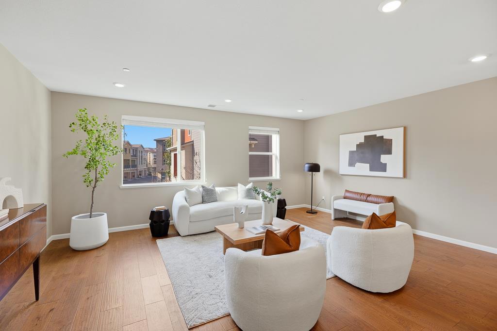 This stunning 2018-built KB Home townhouse perfectly balances modern elegance with functional design. With a desirable northeast-facing orientation, the residence is bathed in natural light through oversized windows, highlighting its airy, open-concept floor plan. At the heart of the home, the chefs kitchencomplete with sleek white cabinetry, a grand center island, quartz countertops, and premium stainless steel appliancesflows seamlessly onto a private balcony, ideal for morning coffee or evening relaxation. The luxurious primary suite features an expansive walk-in closet and a dual-sink vanity. For added versatility, the secluded ground-level bedroom suite is perfect for guests, a home office, or multigenerational living. Additional premium upgrades include a 3-zone HVAC system for personalized comfort, a true side-by-side two-car garage, and low HOA dues for added value and peace of mind. Unbeatable location: minutes from major tech campuses, BART, Great Mall, and major freeways. With access to top-rated Milpitas schools, this home offers a rare blend of style, convenience, and community.