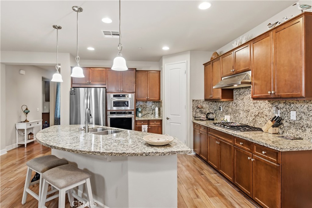 Located in the highly desirable 55+ Solera Diamond Valley Community by Del Webb, this beautiful 3 bedroom, 2 bathroom home offers comfort, quality, and numerous upgrades. The home features an ideal open-concept floor plan with a spacious kitchen that flows seamlessly into the living and dining areas. The kitchen includes stainless steel appliances, granite countertops, a large center island with breakfast bar, upgraded fixtures, a pantry, and a generous dining area. Wood flooring runs throughout the main living and high-traffic areas. The laundry room includes additional storage cabinets and a utility sink. The spacious primary suite offers plenty of room to relax, while the primary bathroom features dual sinks, a soaking tub, and a step-in shower. The second and third bedrooms are also well sized. Additional features include a central vacuum system and solar panels, helping keep electricity costs low. The front patio courtyard provides a great space for relaxing or entertaining. The backyard has been meticulously maintained and features a covered patio, concrete hardscape, low-maintenance artificial grass, and space for shrubs and flowers. Residents of Solera enjoy access to an impressive community center featuring a fitness center with walking track, library, billiards room, conference rooms, theater, indoor pool, two outdoor pools, bocce ball courts, tennis courts, pickleball courts, and a wide variety of social activities and events.