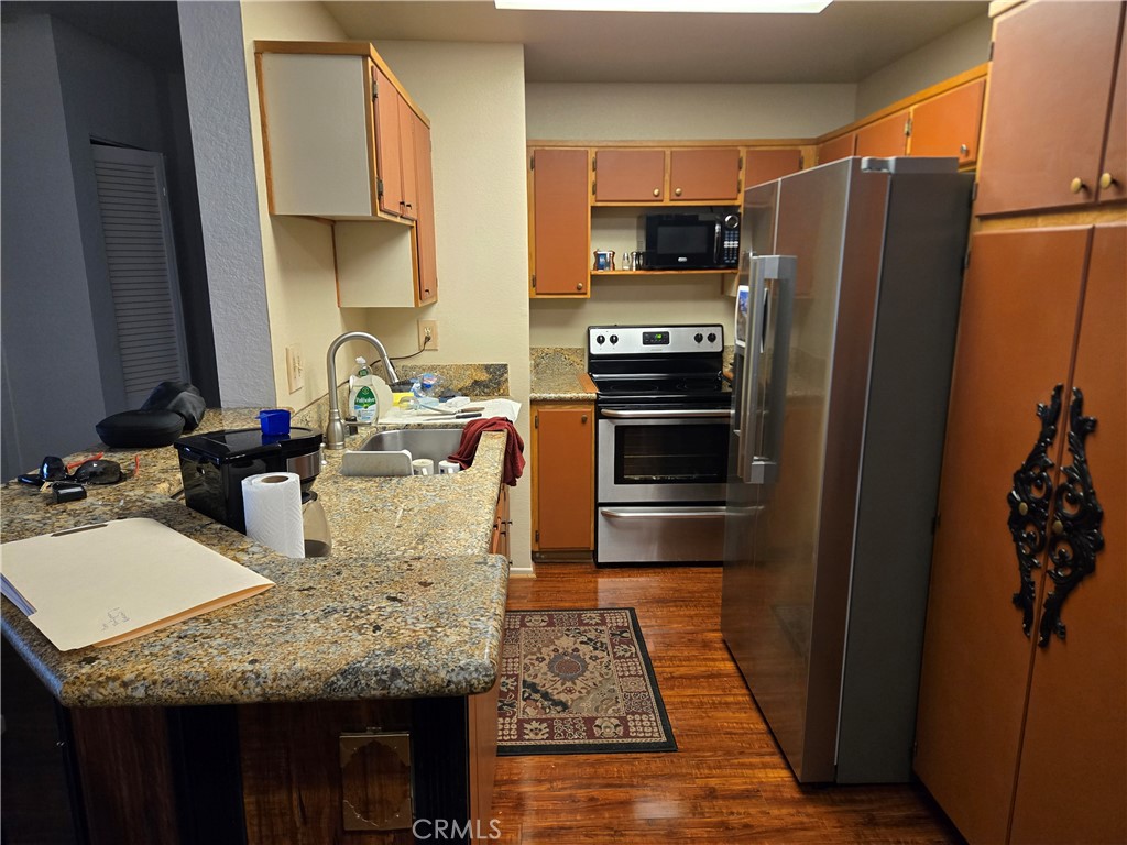Lovely ground level condo with wood flooring throughout. Owner has remodeled this lovely condo including new interior paint and kitchen cabinet doors. As you enter the front yard portion you are impressed by the number of plants and trees that are thriving in the court yard all large boxes that can be easily moved around with a hand truck, thereby giving the new owner many options regarding which plants and where to locate them. All of the fencing has been replaced with newer vinyl style white fencing giving the courtyard a clean look. The garage is just a few steps from the front door and it has some shelves that the owner has built in for storage as well as the standard garage door opener. The owner has replaced all of the interior flooring with wood planks and it looks great. The kitchen has all newer appliances and they will all be included in the sale. This will make a great deal for a first time buyer.