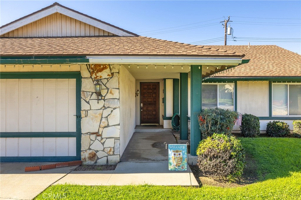 Single-story pool home located in a prime La Verne neighborhood. Attractive curb appeal welcomes you with a manicured lawn, planters, and a long covered patio that leads to the front entry. Inside, the front door opens to a tiled entryway and into both the living and family rooms. The living room features hardwood flooring and a floor-to-ceiling stone fireplace, with an adjacent dining room offering direct access to the kitchen. The kitchen includes wood cabinetry, tiled countertops, panoramic backyard views, and a breakfast nook, all open to the family room for easy everyday living. The family room offers vaulted ceilings, carpeted flooring, and a sliding door that provides access to and views of the backyard. Down the hall are four bedrooms. The primary bedroom enjoys backyard views and includes an ensuite bathroom with a walk-in shower and sliding glass enclosure. Three additional bedrooms are generously sized and share a full hall bathroom. The backyard is ideal for outdoor living, featuring an oversized pool with an elevated tiled backsplash, custom brickwork, a gas fire pit, ample lawn space, and a covered patio that spans the width of the family room and kitchen. Side yards include walkways, with one offering a grass strip that works perfectly as a dog run.
