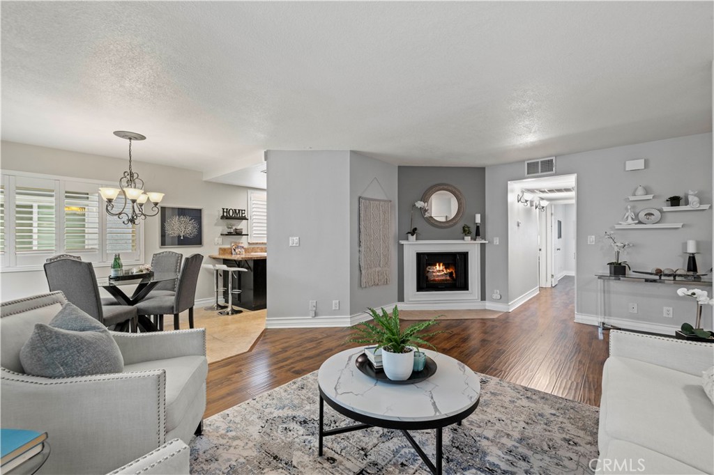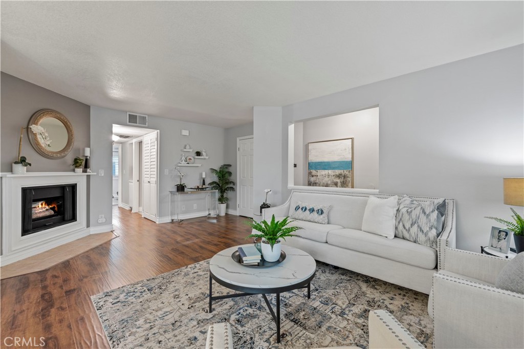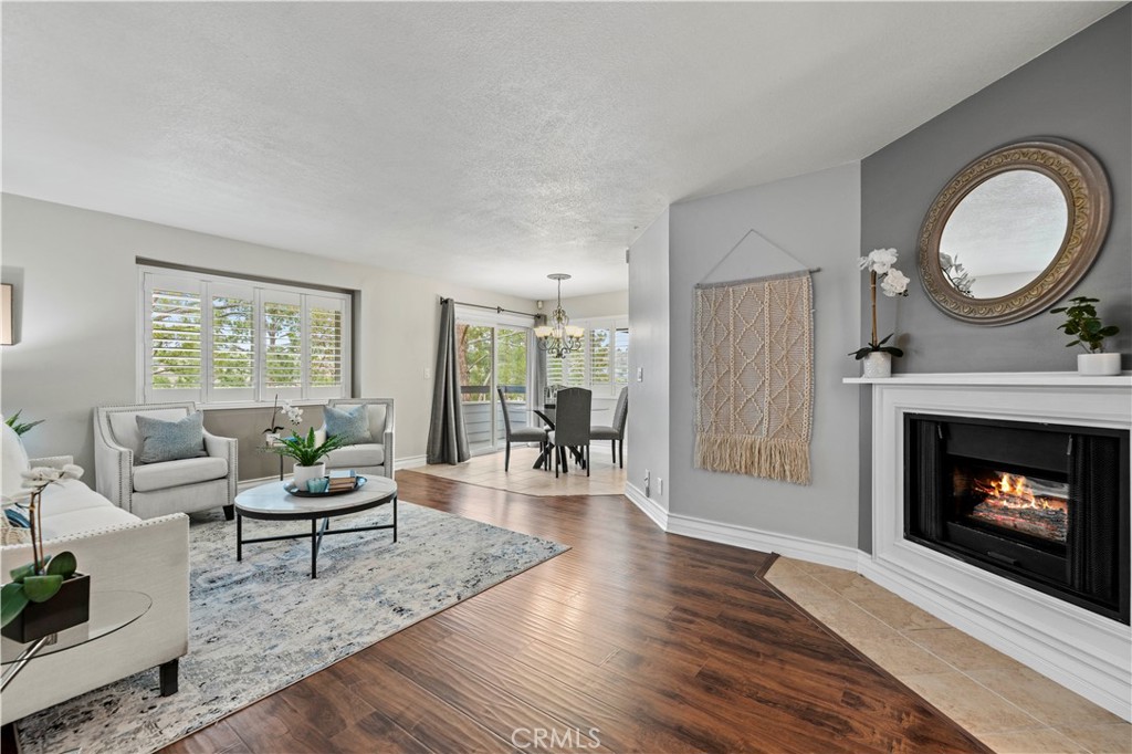 Welcome home to this fantastic 2 bed 2 bath American Beauty Village END-UNIT perfectly situated on an elevated lot providing VIEWS near greenery and includes a detached 2 car tandem garage! Your living room feels spacious with engineered wood flooring and a cozy gas fireplace adjacent to the dining area and beautiful kitchen featuring stainless steel appliances (fridge included), built-in microwave, recessed lighting, breakfast bar, and dark cabinetry for the perfect contrast. Sliders off the dining area provide you with access to the large balcony for you to enjoy a nice elevated view of the neighborhood and the serene privacy provided by mature trees out front. Your windows are all adorned with plantation shutters and you have a laundry closet with newer stackable LG washer/dryer units included. Both bedrooms have ceiling fans and your primary suite includes a large walk-in closet with built-in organizers and a nice walk-in shower. Both of your bathrooms have quartz countertops and satin nickel fixtures with the hall bath featuring lighter wood-like tile. The HOA includes water and trash and several amenities including multiple pools and spas, tennis courts, clubhouse, and 24 hour security. You’re close to plenty of eateries, shopping plazas, and award winning schools. Come take a look and make this your new home!