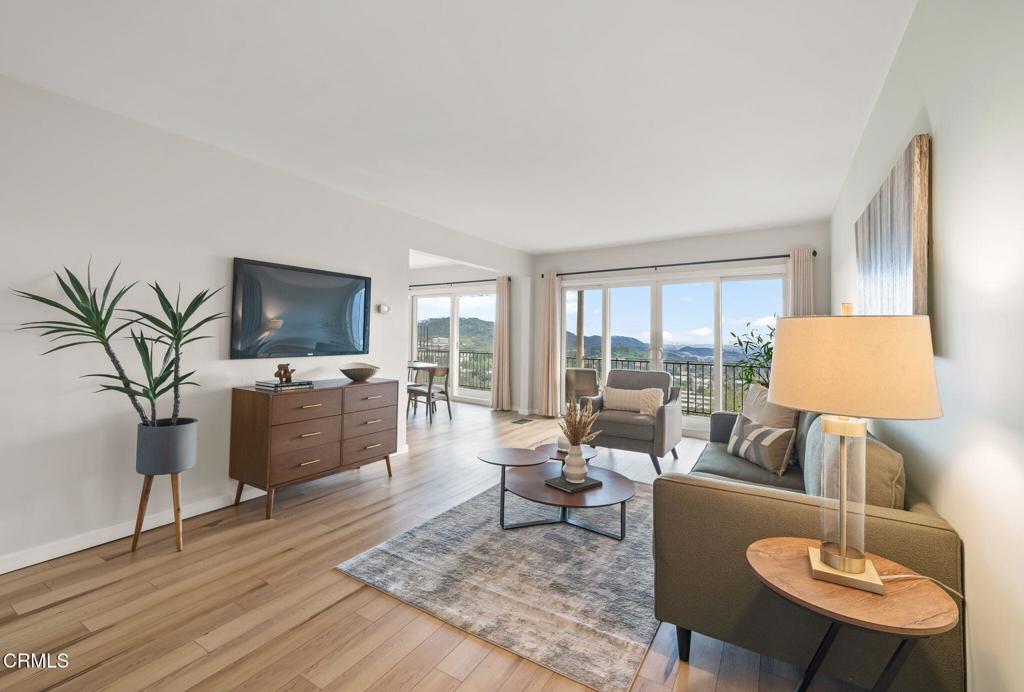 For reals – a large view condo in La Canada with La Canada Schools! Large rooms, ground floor entry, balcony off Living Room, Dining Room and Primary Suite, all with views to DTLA and the Pacific. Whether you want to buy your first place to get into the La Canada Schools or you want to downsize but stay connected to your La Canada circle of friends, this is the place for you. Upgrades include engineered hardwood floors throughout, new kitchen cabinet fronts, updated bathrooms, double pane windows, interior paint, popcorn-free ceilings, dining room fixture. Central HVAC, copper plumbing. Plumbing is in the wall of hall closet for easy install of W/D as other units have done. Easy access to 210 Freeway, Foothill Blvd. and shopping. Small, self-governed HOA -monthly dues pay water, sewer, trash, building insurance.