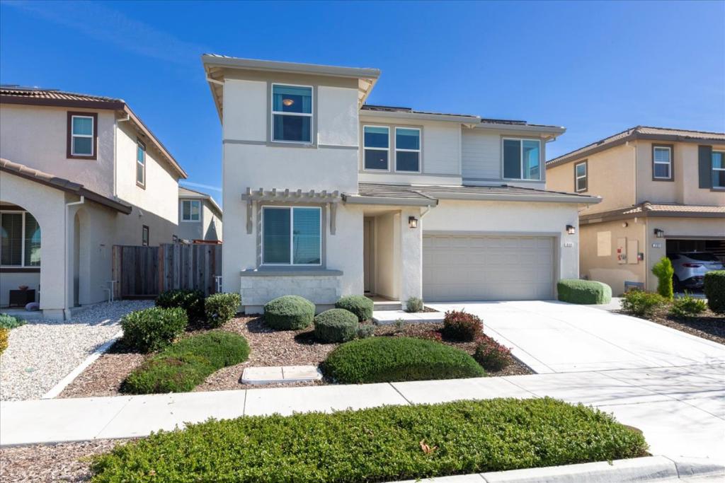 This lovely Kiper Home offers 2,367 sf, 5 bedrooms, and 3 full baths. The main level features a ground-floor bedroom and bath, ideal for multi-generational living or a home office. The open-concept kitchen, dining, and family rooms create seamless flow for everyday living and entertaining. The kitchen features quartz countertops, shaker cabinetry, a walk-in pantry, a center island with farmhouse sink, and high-end JennAir appliances, including range, microwave, and dishwasher. Upstairs, a loft and laundry room provide flexible space, while the primary suite features a spa-like en-suite bathroom, and additional bedrooms share a hall bath with tub/shower. Built-in storage, smart switches, recessed lighting, and Tuscan Bronze fixtures with matte black hardware create a cohesive aesthetic. Owned solar, tankless water heater, and a finished garage with Tesla charger add modern convenience and energy efficiency. The backyard is ideal for entertaining, with pavers, retaining wall, and a small grass area with sprinklers. Park-front location across from the neighborhood park with no HOA, in a family-friendly Hollister neighborhood near recreation, wineries, and Silicon Valley. Stylish finishes, functional layout, and smart upgrades throughout–move-in ready and designed for modern living.