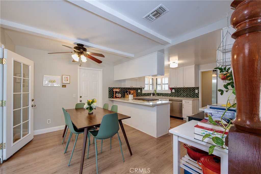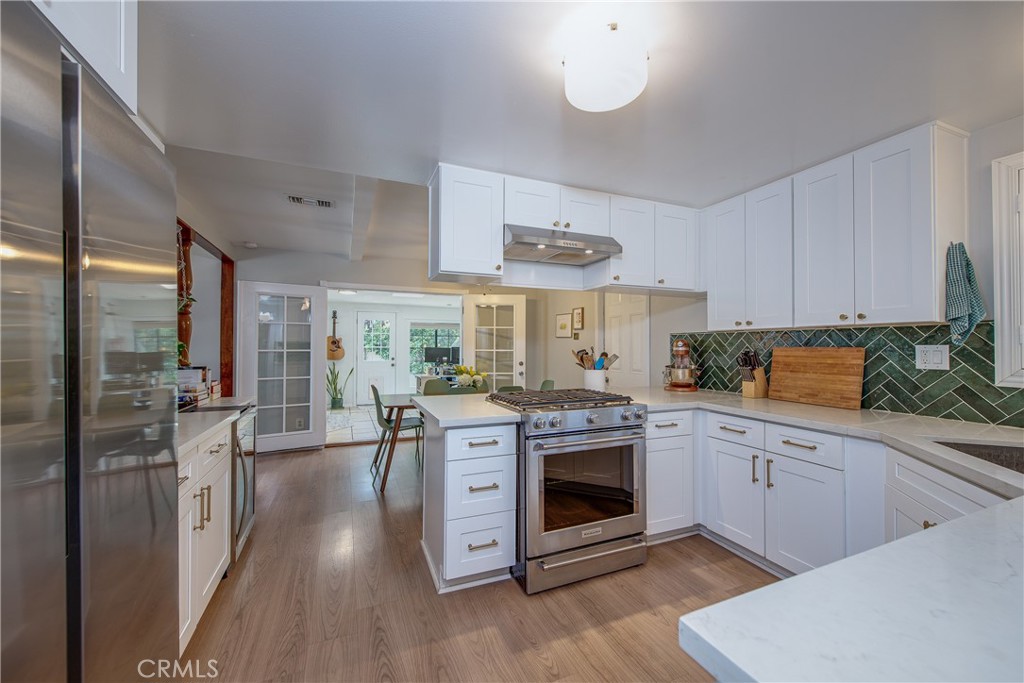 TURNKEY 3-bedroom, 2-bathroom home with owned solar in Grand Terrace, loaded with upgrades and charm! A water-wise landscaped front yard welcomes you into this beautifully maintained property. Inside, laminate flooring flows through much of the home, creating a warm and inviting atmosphere. The remodeled kitchen is a standout feature, offering white shaker cabinets with gold hardware, stylish quartz countertops, a beautiful green subway tile backsplash, upgraded sink, and stainless-steel appliances including a range with an electric oven with a 5-burner gas cooktop. The adjacent dining area provides the perfect space for everyday meals or entertaining guests. The spacious living room features a cozy fireplace for chilly evenings and French doors that open to the large backyard, creating a seamless indoor-outdoor living experience. A versatile bonus room offers flexible space ideal for a playroom, game room, home office, or hobby room. The large primary bedroom, located at the front of the home, includes two walk-in closets, a large window with plantation shutters, a ceiling fan, and an attached bathroom with a newly refinished shower and NEW tile flooring. Bedrooms two and three located across the hall feature ceiling fans and large windows with plantation shutters that overlook the backyard. The hallway bathroom includes a newly refinished bathtub/shower combination, vanity top and sink along with NEW tile flooring. Step outside to the water-wise backyard featuring orange, lemon, apricot, and grapefruit trees, plus a fenced garden area perfect for growing vegetables, and gutters that feed into a water collection barrel to help save on the water bill. The included patio canopy provides a wonderful shaded space to relax and unwind. There is plenty of parking in the wide driveway and the two-car garage that is brightly lit with a skylight and large window. Additional upgrades include a new water line from the home to the street, a new heater furnace and blower, and a new water heater in 2024, just to name a few. Conveniently located minutes from schools, shopping, dining, and freeway access for easy commuting. Don’t miss this opportunity—schedule your showing today to see this beautiful TURNKEY home!