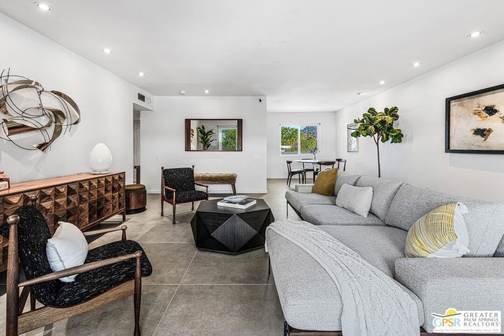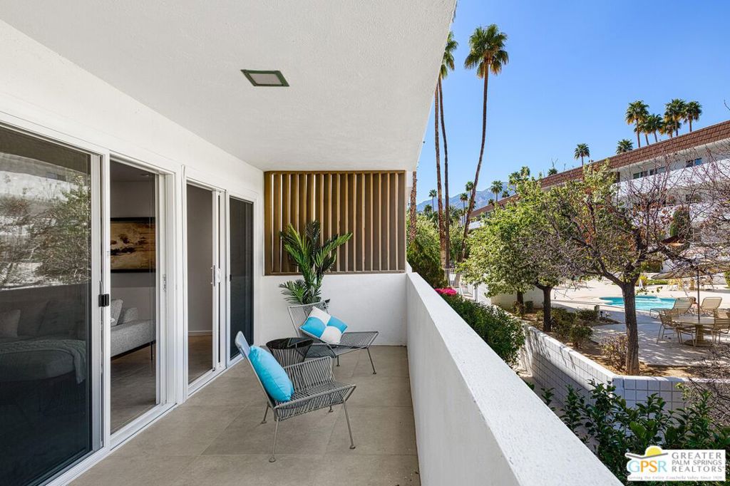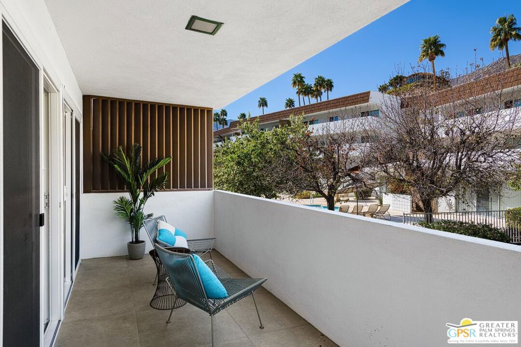 Welcome to Canyon View Condos, a 1963 Donald Wexler and Richard Harrison designed community, an anchor of Roy Fey’s vision for his celebrated Canyon View development. Overlooking iconic architecture of Canyon View Estates, and views of South Palm Springs mountain ranges, Canyon View Condos is one of Palm Springs’ hidden architectural gems, a model of sensible and efficient Mid-Century resort living. This unit was extensively renovated in 2024 to the highest standards of design and quality. The improvements include replacement of HVAC systems, tankless water heater, and energy efficient windows and sliders. Designed for peace and privacy, with a soundproofing barrier installed under large-format porcelain tile flooring, the unit is on the low-traffic, Skyview Drive side of the complex. Smart LED lighting, smart Yale lock and Ring security systems are in-place. The unit has fabulous natural light from east and west exposures, welcoming breezes on pleasant days. Two sliders in the expansive living room open to a 45-foot long terrace, with continuous porcelain tile that extends from the living areas. This outdoor retreat overlooks the common garden and its grove of mature citrus trees, and the shared pool and spa amenities. The thoughtfully renovated kitchen is complete with white cabinetry from BOXI by Semihandmade, and bright quartz counters; For cooking convenience and pleasure, the windowed kitchen is furnished with Grohe faucet, garbage disposal and energy-efficient Samsung appliance suite (induction/convection range, microwave, dishwasher, French-door refrigerator.) A Miele ventless washer dryer is installed next to the kitchen. Bathrooms are renovated to the same high standards with new vanities, Grohe fixtures, and new tiling throughout. The primary suite is wide and open, with direct access to the terrace. The second bedroom, across from the guest bathroom, is suitable as a guest room, den, or home office. The unit comes with an assigned, covered 1-car parking space and adjacent large private storage closet. This home sets the stage for stylish low-maintenance desert living, a space for welcoming family and friends amongst South Palm Springs’ best mid-Century architecture and celebrated nature trails. Personal property available to purchase outside of escrow.