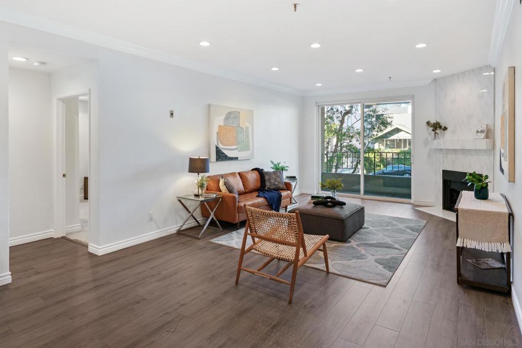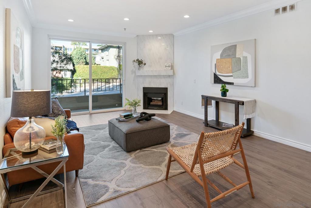 Welcome to luxurious urban living in the heart of Bankers Hill, where this spacious 2-bedroom, 2-bathroom condo offers the epitome of comfort and convenience. Boasting the largest floor plan in the building, this residence is designed for those seeking ample space and modern elegance. Upon entering, you’re greeted by an open layout that seamlessly integrates the living, dining, and kitchen areas with a private balcony and fireplace. The kitchen is a chef’s dream with high-end stainless steel appliances, complemented by a modern farm sink featuring a convenient touchless faucet. Sleek countertops and ample cabinetry provide both style and functionality. Located in highly desirable Bankers Hill, residents enjoy the convenience of walking to nearby attractions such as Little Italy, Balboa Park, and Waterfront Park. The building amenities include a refreshing pool, relaxing jacuzzi, and a well-equipped fitness room, catering to both relaxation and active lifestyles. Both bedrooms are generously sized, each featuring its own bathroom. The primary bedroom offers a luxurious shower, offering a spa-like retreat within your own home. The second bedroom features a jacuzzi tub with shower, a large built-in desk, and a spacious walk-in closet, ideal for those who work from home or need extra storage. Throughout the condo, you’ll find wood laminate flooring, recessed lighting, and crown molding, creating a contemporary ambiance. Two reserved parking spots with additional storage complete this offering, ensuring convenience and security for your vehicles and belongings.