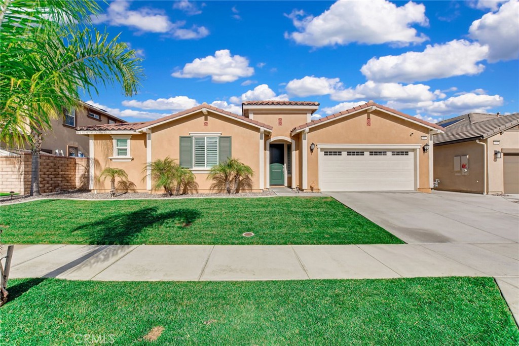 SINGLE STORY SALTWATER POOL HOME located in the desirable Audie Murphy Ranch community of Menifee, built in 2021 by Richmond American Homes featuring the Julia floor plan with an open and functional layout and modern finishes throughout, including a fourth bedroom option in place of a tandem garage. The exterior offers mature landscaping and a private backyard with an in-ground saltwater pool and spa, vinyl fencing, and space for outdoor use. Private backyard includes a freestanding pergola creating a shaded outdoor seating space. Interior highlights include luxury vinyl plank flooring in the main living areas, carpeted bedrooms, abundant natural light, upgraded lighting, window shutters in the bedrooms, shades in the main living area, and an open great room with ceiling speakers. The kitchen features a quartz extended island, GE Profile black stainless steel appliances, double oven, large pantry, and ample cabinetry. The primary suite includes an ensuite bathroom with soaking tub and custom shower, while three additional bedrooms provide flexible living space. Additional features include a tankless water heater, 24 leased solar panels, and a two-car garage with automatic door openers. Community amenities include pools and spas, tennis courts, walking and biking trails, parks, barbecue areas, clubhouse, and skate and sport parks, with convenient access to award-winning schools, shopping, medical facilities, and the 15 and 215 freeways.