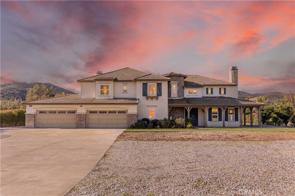 Welcome to this expansive estate nestled within the exclusive gated community of Wynfield Estates in Murrieta. Set on 2.3 acres of private, usable land, this impressive two-story residence offers a rare blend of space, comfort, and resort-style living surrounded by rolling hills, scenic views, and the peaceful ambiance Wynfield Estates is known for. Ideally located near top-rated Murrieta schools, shopping, dining, and Temecula wine country, this home delivers both privacy and convenience. A charming wraparound porch and grand entry invite you inside, where tall ceilings, real wood floors, and abundant natural light create an immediate sense of scale and warmth. The thoughtfully designed floor plan opens seamlessly upon entry, featuring a formal dining room perfect for gatherings, expansive living areas, and an inviting flow throughout the main level. A spacious downstairs office offers views of the backyard and the gorgeous mountain backdrop beyond, creating an inspiring work-from-home setting. A full bedroom and full bathroom on the main level provide flexibility for guests or multigenerational living. Additional highlights include a half bath, storage closet, and a large laundry room with sink and wash-off area. Upstairs, a dramatic stairway window fills the home with natural light and leads to generously sized bedrooms, each with direct bathroom access. The primary suite is a true retreat, showcasing a fireplace, an enormous private deck ideal for taking in the sweeping views, a spacious bathroom with soaking tub and separate shower, and dual walk-in closets. Secondary bedrooms include a Jack-and-Jill configuration and oversized walk-in closets, offering comfort and functionality throughout. Designed for entertaining and outdoor enjoyment, the backyard is a private oasis featuring lush grass, stone pathways, garden beds, a children’s play area, fire pit, and a sparkling pool and spa with spill over into the pool. An Alumawood deck supported by reinforced concrete pillars creates the perfect space for outdoor living, while a prepped outdoor kitchen area awaits completion. Beyond the pool lies over an acre of additional usable land, offering endless possibilities for recreation, expansion, or future amenities. Additional features include a 4-car attached garage with epoxy flooring and paid-off solar. This exceptional estate offers space, privacy, and an elevated lifestyle in one of Murrieta’s most desirable gated communities.