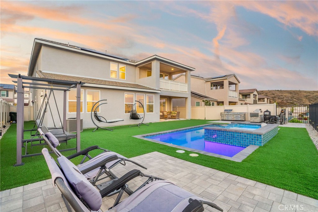 Positioned one of Skyline’s most desirable streets with stunning jetliner views. This captivating 2-story home, built in 2020 and finished with an extensive amount of builder upgrades. A perfect blend of modern amenities and detailed craftsmanship. Featuring 3,546 square feet of living space, 5 bedrooms and 5 bathrooms . The two story entry opens with a direct view of the stunning backyard oasis. The modern chef’s kitchen features an oversized island with breakfast bar, stainless steel appliances, double ovens, and a walk-in pantry. The kitchen overlooks the dedicated dining room, and opens seamlessly to a spacious family room. A large multi-slide door connects the living space to the covered patio, creating effortless indoor-outdoor flow. A downstairs guest wing with it’s own private entrance offers versatility and perfect for multigenerational living or separate home office. A bonus room behind French doors—ideal as a home study or den. Upstairs, a bright loft anchors the secondary living space and two generously sized bedrooms with a shared bath along with an additional junior suite filled with natural light. The oversized primary retreat is a standout, complete with an expansive private balcony, spa-inspired bath with freestanding tub, walk-in shower, dual sinks, and a massive walk-in closet. Outside, the fully upgraded entertainers backyard offers an in-ground pool with custom lighting, built-in BBQ, and sweeping city-light views. Other features include fully paid-off solar panels, exterior lighting, and select areas prewired for sound, offering potential for integrated audio. Skyline residents enjoy access to two beautiful clubhouses with resort-style pools, a state of the art gym, spa, fire pits, and more. Close to award winning and highly coveted private and public schools, many shops and restaurants, and hiking trails with easy freeway access.