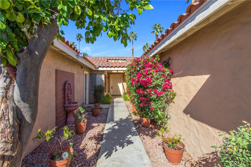 This Oasis slice of Paradise in the Monterey Country is move in ready. Beautifully refurbished with new desert color painting throughout, new carpeting, and existing cleaned tile and grout. The 3rd room boasts a beautiful office with built-in desks for two, and bookshelves. A unique feature of this home is entry access from garage into 2nd bedroom for convenience of carrying packages and groceries directly into home, as well as an entryway thru front walkway with charming fountain, lush bougainvillea, grapefruit tree, Roses and Gardenias in potted plants with drip watering system. Kitchen features granite counter tops, custom built-in cabinets, new refrigerator, kitchen oversees the fairway thru plantation shutters and a pass thru window for ease of outdoor entertainment. The view from back of home looks out thru beautiful Plantation Shutters to the 6th hole East Course, on a immaculate Ted Robinson designed 27 Hole Golf Course. Also enjoy Tennis, Pickleball and Bocce Ball courts along with 37 sparkling pools and Jacuzzi’s with a beautiful Clubhouse featuring an amazing Restaurant and Bar, with plenty of fun social events. The skylights thru vaulted ceiling in living room/dining area allow a perfect Southeast exposure for plenty of morning sunshine and cooler afternoons. Enjoy skylighted windows in master bd and office for fresh air and natural light. Tile in both bathroom showers are a beautiful southwestern design and color. Both bathrooms feature new medicine cabinets. Ceiling fans provide great air flow for better use of heating and cooling. The living room boasts a built-in wet bar with mirror around built-in cabinets and a gas fireplace. Enjoy a charming Terracotta patio to enhance your plants and patio furniture. Garage has ample storage built in cabinets on both sides. Capped gas line located on outside patio for BBQ.