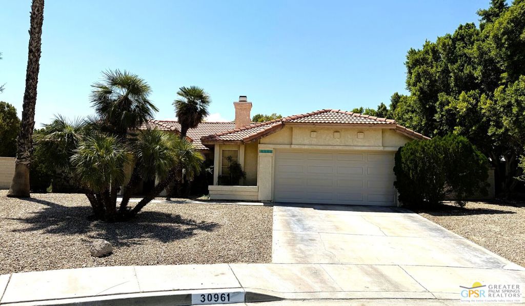 This home is conveniently located in the Century Park neighborhood on a quiet cul-de-sac and is move in ready. It features an open floorplan with vaulted ceilings and it has fresh paint from top to bottom. It has 3 bedrooms and 2 baths with tile flooring throughout for easy cleaning. The living room has a corner gas fireplace to create a nice ambiance. There is a French door off of the dining area leading to a pergola covered back patio the length of the house perfect for outdoor entertaining. The primary bedroom features a walk in closet and also has a French door to the patio. There is an attached 2-car garage with new overhead door and new side service door. Desert landscaping for easy maintenance. The back and side yard are quite large and would be perfect to add a pool and/or spa or play area. Set up an appointment to view this great home now!