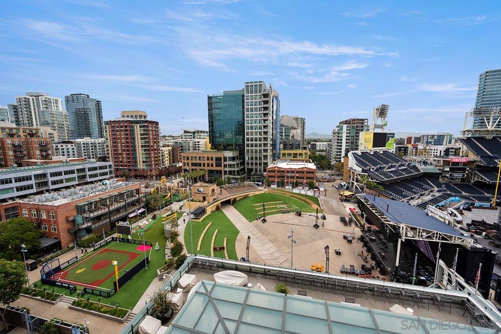 This 10th floor 2 bedroom/2 bath condo at The Legend is a homerun; captivating views directly into San Diego’s famed Petco Park! First time ever offered for sale by the original owner, enjoy baseball games and open-air concerts right from your living room or your spacious balcony – or from the incredible 7th floor ‘Club Legend’ deck. Great natural light from expansive windows, new paint and carpet, a split-bedroom floor plan ideal for privacy, and an open-concept granite and stainless kitchen. Complete with a parking space near the elevator and private storage just steps from your front door. First of this floor plan to hit the market in 6 years! See supplement for more details. The gourmet kitchen is a chef’s dream, showcasing stainless appliances, granite countertops, European-style cabinetry, and an inviting eat-at bar illuminated by elegant pendant lighting. Floor-to-ceiling windows not only flood the condo with natural light but also offer breathtaking, unobstructed views of Petco Park and Gallagher Square. The split-bedroom floor plan is perfect for privacy for roommates or guests. The primary bedroom suite doesn’t skimp on views either. The ensuite bathroom features a dual vanity, tasteful custom tile backsplash, and frameless glass-enclosed shower. The Legend is the only residential high-rise to be built inside the gates of our Major League Ballpark & the only residential tower to be built on the 3-acre Park at the Park / Gallagher Square! This iconic building overlooking the Padres ballpark (voted the best ballpark in America) will be treasured for generations with historic detailing preserved by Bosa Development to create a world-class residential tower. The Legend is centrally located just a few blocks from the Gaslamp Quarter & Marina District for convenient access to endless shopping & dining options. The Legend’s amenities include a 2nd floor rooftop deck looking out over Park at the Park complete with pool & spa, fully equipped fitness room, roof garden, barbeque area, steam, sauna, and changing rooms. Entertain guests in ‘Club Legend’, the 7th-floor social lounge featuring a sprawling rooftop terrace with panoramic Petco Park views and a cozy outdoor fireplace lounge and outdoor kitchen. Additional conveniences include guest parking reservations via mobile app, 24-hour concierge and security services, and plans for EV charging stations within the secured garage. Previous builder documents cited 972 sq .ft., assessor records now indicate 888 sq. ft. VA Approved (000017) & FHA Approved(S007729)!