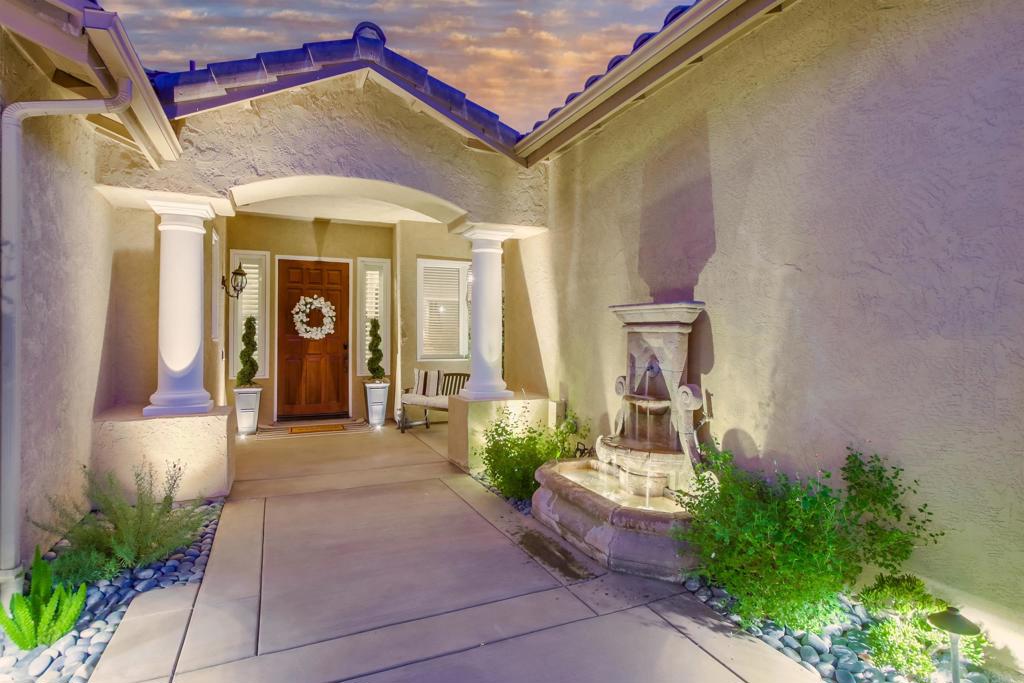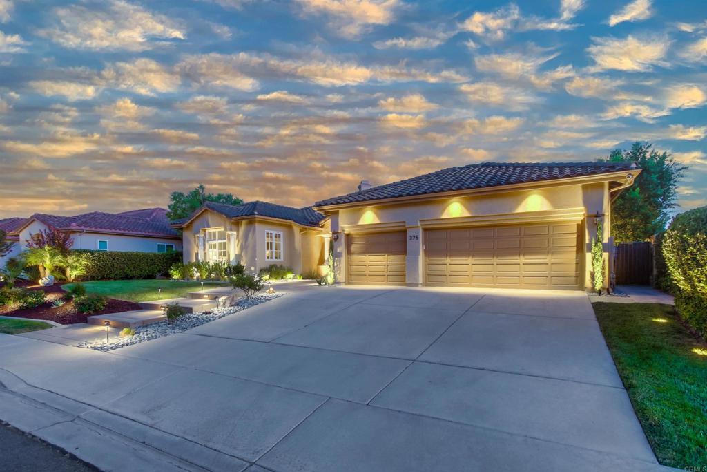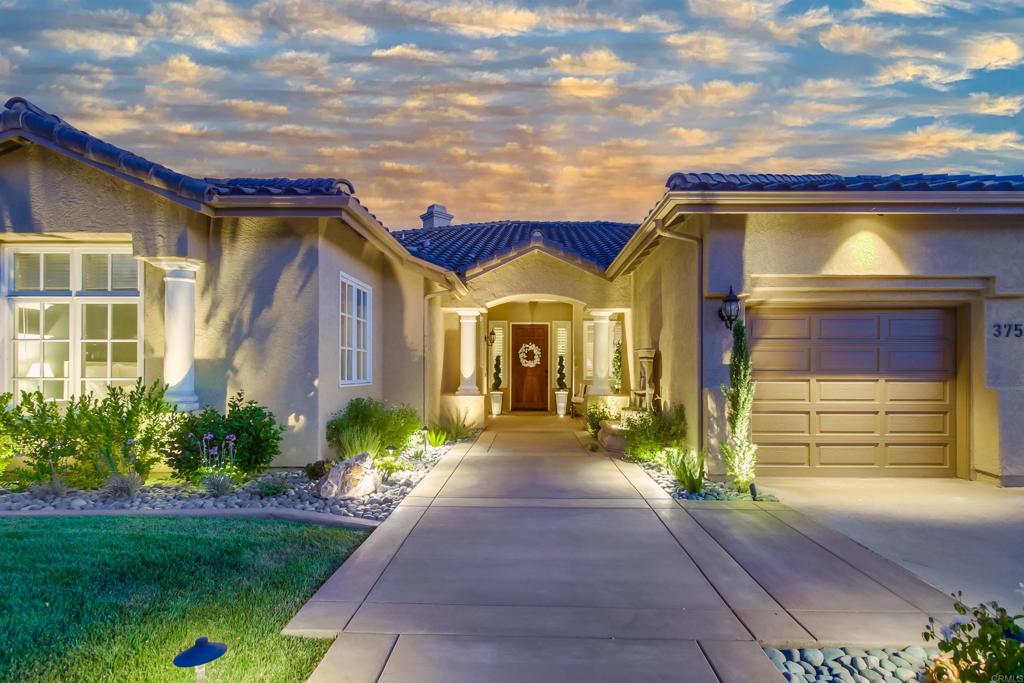 Welcome to 375 Camino Bailen Dr., a stunning 2,813 sq. ft. single-story sanctuary nestled in a prestigious gated community. This sophisticated 4-bedroom plus office, 3.5-bathroom residence blends modern elegance with unparalleled comfort, featuring a freshly painted interior adorned with exquisite crown molding and expansive baseboards. The spacious great room and family room are designed for relaxation and gatherings, while the gourmet kitchen boasts quartz countertops, stainless steel appliances, and a large island. The master suite offers a cozy fireplace, walk-in closet, and spa-inspired bathroom for ultimate tranquility. Outside, entertain effortlessly on the gorgeous covered patio with a fireplace & built-in BBQ, or unwind in the luxurious 7-person Jacuzzi, surrounded by breathtaking valley and hillside views. A state-of-the-art solar system promotes eco-friendly living and covers the electric usage for the home, while the 3-car garage provides ample space for vehicles or storage. Beautiful accent and outdoor lighting enhances the home’s charm day or night, complemented by automated front and rear sprinkler systems and a dedicated dog run for pet lovers. With high ceilings, hardwood floors, smart home features, and an office for added versatility, this exceptional home offers the perfect fusion of luxury, functionality, and sustainability.