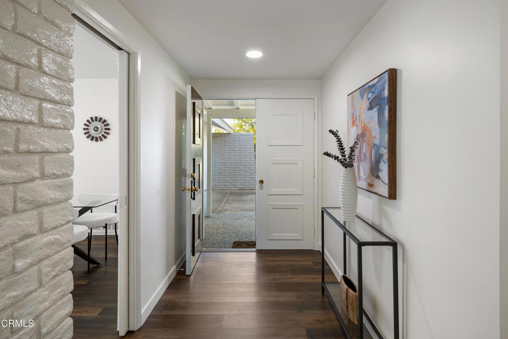 Set within a beautifully manicured Monrovia neighborhood with close proximity to the foothills & sweeping views south across the valley, this inviting residence offers comfort, functionality & a seamless indoor-outdoor connection. The driveway leads to a charming covered front porch & double-door entry. Inside, wood-look flooring flows throughout the home & recessed lighting creates a warm, cohesive feel in the main living spaces. Immediately to the right, the home opens to the dining area & updated kitchen, anchored by a raised fireplace & concrete bar-style countertop, perfect for casual gatherings or everyday living. The kitchen features Calacatta Quartz countertops, updated cabinetry, stainless steel appliances, including a gas range, range hood & a bay window above the sink. A direct door connects to the attached 2-car garage, which includes laundry & additional storage. Just beyond the kitchen, the family room offers recessed lighting, a pass-through window with counter seating ideal for entertaining & a sliding glass door that opens to the backyard patio. Pocket doors connect the family room to the living room, allowing for both open flow & private separation when desired. The living room is highlighted by a raised stone hearth fireplace, recessed lighting, wood-look flooring & another sliding glass door that enhances natural light & access to the outdoors. The backyard features a paved patio surrounded by mature fruit trees, creating a tranquil space for dining al fresco, relaxing, or hosting gatherings. A hallway off the living room leads to 3 bedrooms & 2 bathrooms. The first bedroom offers dual-pane windows & a generous closet. A second well-sized bedroom sits at the end of the hall, also featuring dual-pane windows. A full hallway bathroom includes a tub & shower combination, a dual-sink tiled vanity, recessed lighting & convenient linen storage nearby. The primary suite is privately situated on the opposite side of the hallway & features a spacious closet & a sliding glass door opening directly to the backyard patio. The ensuite bathroom includes an additional closet, oversized single-sink tiled vanity, recessed lighting & a tiled walk-in shower. With its thoughtful layout, inviting outdoor spaces, desirable Monrovia location near the foothills & moments from Old Town Monrovia’s shops, dining & entertainment, this home offers an exceptional opportunity to enjoy both comfort & scenery in a well-established neighborhood.