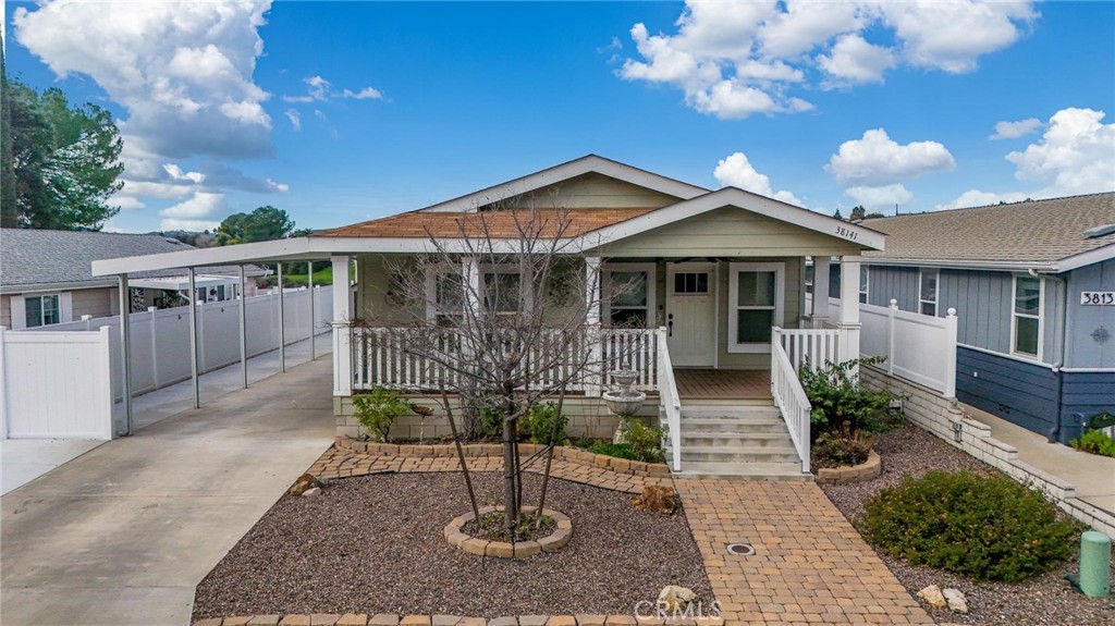 * VIEWS * CRAFTSMAN STYLE HOME * NO SPACE RENT * OWN THE LAND * Welcome to this charming 3-bedroom home in the sought-after 55+ Warm Springs Knolls community. The property is on a permanent foundation, offering added value and convenient financing eligibility. A rare opportunity to own a home offering panoramic views from an oversized, covered back patio located just off the primary bedroom. Walking up to the home, you’ll be greeted by wide front porch stairs that lead to an oversized covered front porch featuring a ceiling fan. Step inside to a bright, open great room that seamlessly blends the living space, kitchen, and dining area, accented with crown molding, window sills, a paneled ceiling, and engineered wood flooring. The kitchen offers a large island with convenient barstool seating, enhanced by custom pendant lighting, along with ample cabinetry, generous Corian counter space, a pantry, dishwasher, and microwave. Walking down the extra-wide hallway, you’re led to the light-filled primary bedroom, where gorgeous views are immediately showcased through French doors opening to an oversized covered back porch. The primary bedroom is highlighted by a pan ceiling, crown molding, a walk-in closet, and a ceiling fan. The primary bathroom features a Corian countertop, a soaking tub, and a separate shower. This home also offers two additional bedrooms and a convenient laundry/mudroom. Step out to the backyard from the covered back porch, where artificial grass creates a low-maintenance space and a spot is ideal for a table and chairs to enjoy canyon and mountain views. The backyard also includes a garden box for your planting enjoyment, vinyl fencing lines the sides of the home for added privacy. The property features a generous covered carport with an expanded slab for additional parking or workspace, with two storage sheds for extra storage. The Warm Knolls community features a clubhouse with a pool, spa, kitchen, library, outdoor BBQ, and dining room. Additional features include fire sprinklers and 6-inch walls for enhanced insulation. This is a must see custom designed home!