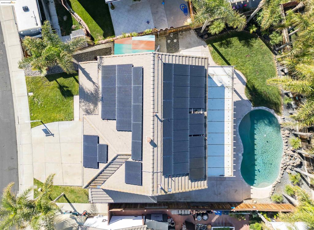 This beautifully maintained home blends timeless design with thoughtful upgrades throughout. The ground floor features elegant travertine tile flooring that enhances the home’s warm, inviting feel. The remodeled kitchen is a true showpiece with designer cabinetry, gorgeous granite counters with smooth beveled edges, a full mosaic-tile backsplash —perfect for cooking and entertaining. A fireplace with granite surround adds both elegance and comfort to the living area. The flexible floor plan includes five bedrooms, with a full bed and bath downstairs ideal for guests or multigenerational living, plus a bonus room and private office/den offering space for work or play. Step outside to your private tropical retreat featuring lush palms, a free-form sparkling pool, and a spacious lawn for relaxation and play. Enjoy an expansive covered patio with raised color stamped-concrete and cooling ceiling fans—a perfect setting for gatherings, dining, or simply unwinding outdoors all year long. Paid-off solar keeps energy costs low, even with the A/C and pool running. Located in one of Discovery Bay’s most desirable neighborhoods, close to parks, shopping, and recreation—this home is move-in ready and truly a must-see!