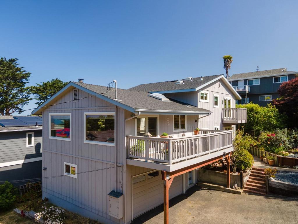 Tucked at the top of 14th Street, this Montara gem offers privacy, ocean views, and flexible living. The upper level features 3 bedrooms and 2 baths with designer touches throughout – wood floors, curated finishes, and great natural light. The open living area flows to a deck, offering your own serene spot for morning coffee or sunset unwinding. Two of the bedrooms also enjoy ocean views, while the primary suite opens to its own private deck. Downstairs offers 1 bedroom, 1 bathroom and a family room with a separate entrance. Providing ideal space for guests and extended family. Out front, a lush and colorful garden adds charm and curb appeal, while the peaceful setting feels like a true retreat. Just minutes to trails, beaches, and Montaras local spots, this home is anything but cookie cuttercoastal living at its finest.