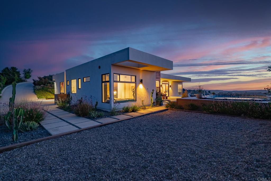 A rare architectural gem—modern, private, unforgettable. This striking dramatic home is in a breathtaking natural setting on nearly 12 acres with panoramic views of the valley and thousands of acres of Cleveland National Forest. Inside, 11- and 12-foot ceilings, skylights, and architectural windows fill the space with light and style. Rich wood floors and a massive island kitchen with both granite and quartz counters make it ideal for entertaining. The sunken living room centers around a fireplace and showcases spectacular views of hawks in flight and endless mountains. The primary suite is its own retreat—separate wing, walk-in closet with built-ins, window niches, coffee station, and a spa-like bath with a soaking tub. Outside, stone paths lead to more views. The private pool surrounded by endless views—like living in your own nature preserve. Paid for solar and whole house generator. No other home in Ramona offers this level of modern design in such a serene setting. It’s truly a showstopper.