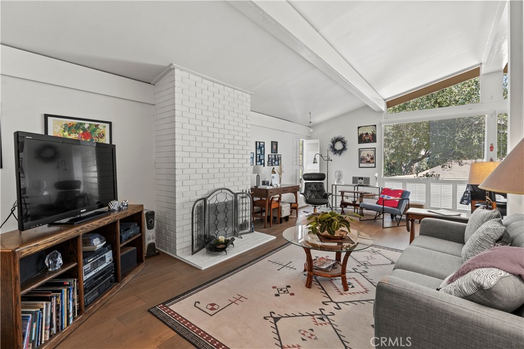 Light-filled mid-century post and beam artist’s retreat nestled in the hills of the Santa Monica Mountains. Floor-to-ceiling windows and soaring open-beam architecture bring natural light and sweeping views of mature oaks into the main living space. Located south of Ventura Boulevard close to the Woodland Hills Country Club golf course—with quick access to Woodland Hills shops and restaurants. Remodeled interior features engineered wood and ceramic flooring, classic fireplace, nestled book nook, and sliding glass door opening to deck. The thoughtfully designed kitchen offers quartz countertops, custom soft-close cabinetry, premium appliances, recessed lighting, and dimmable under-cabinet lighting—combining function and elegance. Two primary bedroom suites on upper level, each with beautifully remodeled bathrooms featuring Kohler fixtures, walk-in showers, and soft-close cabinet doors. Utilities have been upgraded, and home includes a large two-car garage, stylish security entry, and structural improvements such as shear walls and bolting—providing peace of mind in a timeless, private Woodland Hills setting.