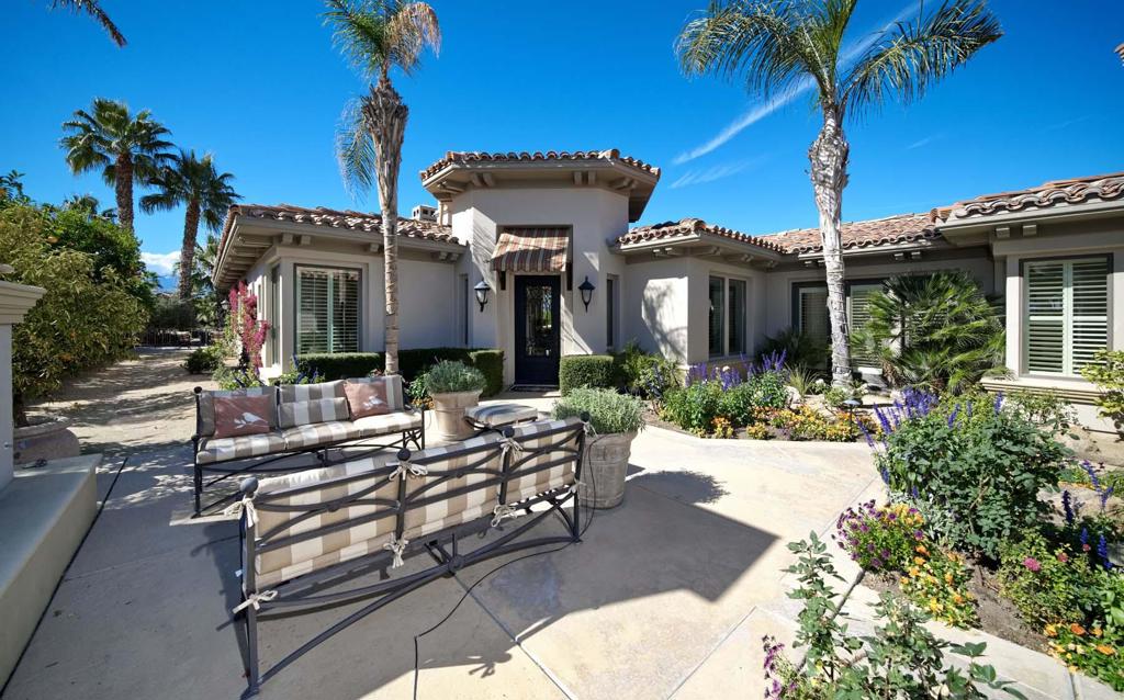 This beautiful home inside Toscana Country Club offers gorgeous western views of the desert mountains, lake, and the Jack Nicklaus Signature Golf Course. The welcoming courtyard includes a sitting area with a dramatic outdoor fireplace that connects the private guesthouse and the main home. Inside, the residence showcases refined finishing details throughout, including finely crafted built-ins, custom crown molding, beautiful light fixtures, and a Control4 home automation system providing remote access to HVAC, security, lighting, and pool functions. Additional highlights include owned solar and a complete HVAC replacement in 2022.The great room features 10-foot stacking doors that seamlessly blend indoor-outdoor living, along with a breakfast nook, formal dining area, fireplace, and wet bar ideal for entertaining. The gourmet kitchen offers abundant cabinetry, an island with separate breakfast bar, and premium high-end appliances, including double ovens, a range with hood, and a cabinet-panel refrigerator.The primary suite offers a luxurious bathroom with soaking tub, large shower, and a private covered patio overlooking the custom pool and spa. Guests will enjoy a private detached guesthouse with a sitting room and en-suite bath, as well as additional main-home guest bedrooms, each with its own en-suite bath.