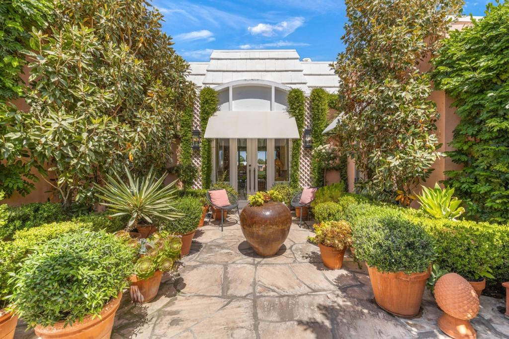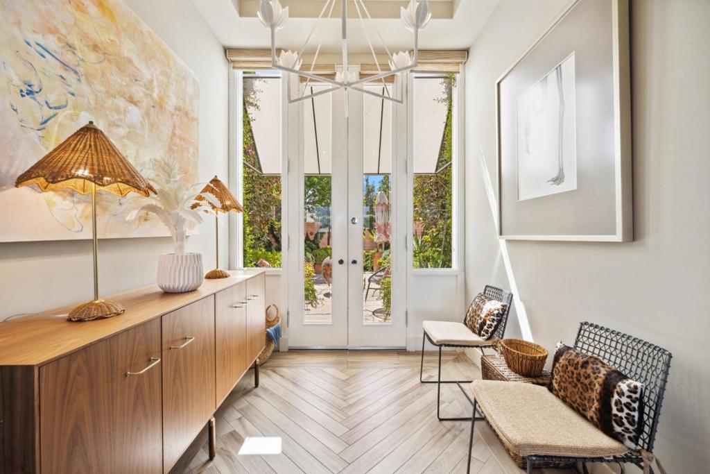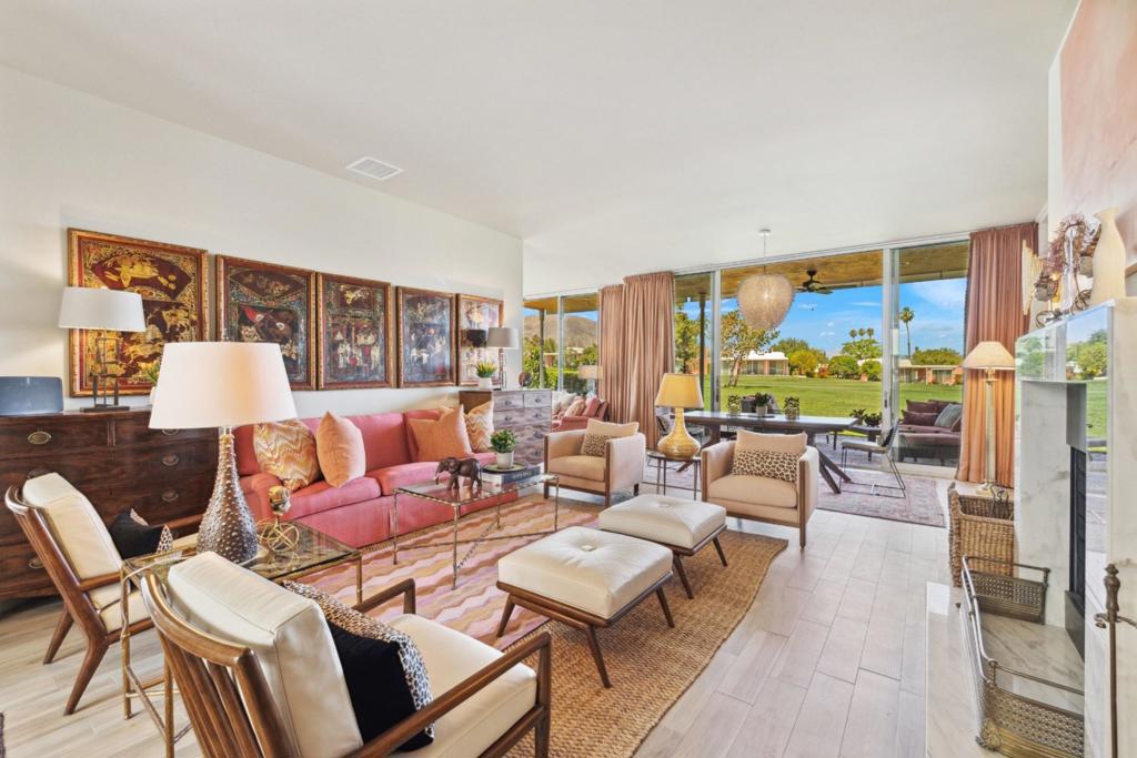Situated in prestigious Marrakesh Country Club, this Hollywood Regency Villa is a triumph of modern classic luxury. Enter through wrought-iron gates into the east-facing courtyard, landscaped in the timeless style of a Mediterranean villa, and step through the iconic Marrakesh double doors. This three-bedroom, three-bathroom, 2,566 sq. ft. Plan D–the largest of the original floor plans–was elegantly reimagined from the framework out, showcasing timeless sophistication. The great room reveals a marble fireplace, and floor-to-ceiling windows framed with custom drapery, flooding the home with light. These showcase wide fairway views and stunning north-west mountain vistas. Outside, a wrap-around cobblestone patio with retractable awnings invites gatherings and relaxation. The gourmet kitchen dazzles with Calcutta marble countertops featuring double waterfall-edges and a breakfast bar, marble chevron backsplashes, walnut-finished cabinetry, a built-in wine refrigerator, gas range, and Sub-Zero refrigerator. The generous primary bedroom is a glamorous retreat–the ensuite featuring a marble shower, walk-in closet with built-ins, and views of an open atrium brimming with light and lush greenery. Two guest rooms include one suite with front courtyard access and custom built-ins, and another with an extra room featuring twin beds that can be closed off, both enhanced by grass cloth wall coverings and marble counters and showers. Marrakesh is a boutique country club with an ideal central valley location amongst a few of the desert’s finest private clubs. Amenities include 18-hole private executive golf course, tennis, pickleball, 14 pools and spa, a fitness center, and an active and newly-remodeled clubhouse with fine dining. Marrakesh is near famous El Paseo with all of its elegant boutiques, restaurants, art galleries, and coffee houses. Experience Marrakesh — Book your private tour today