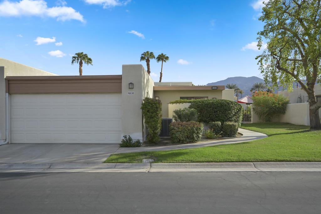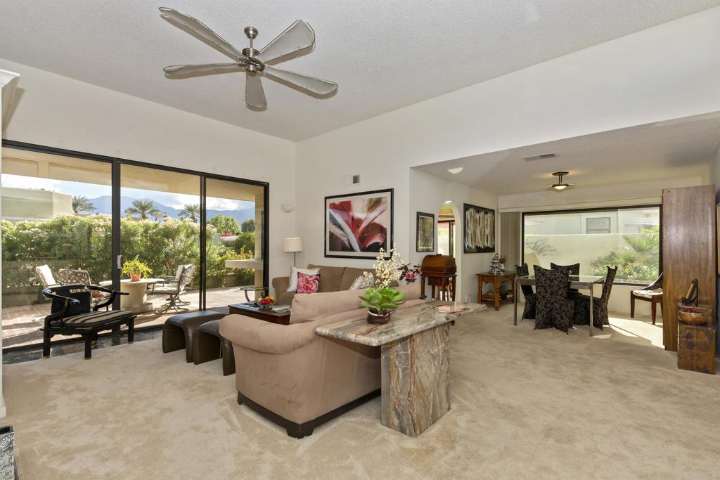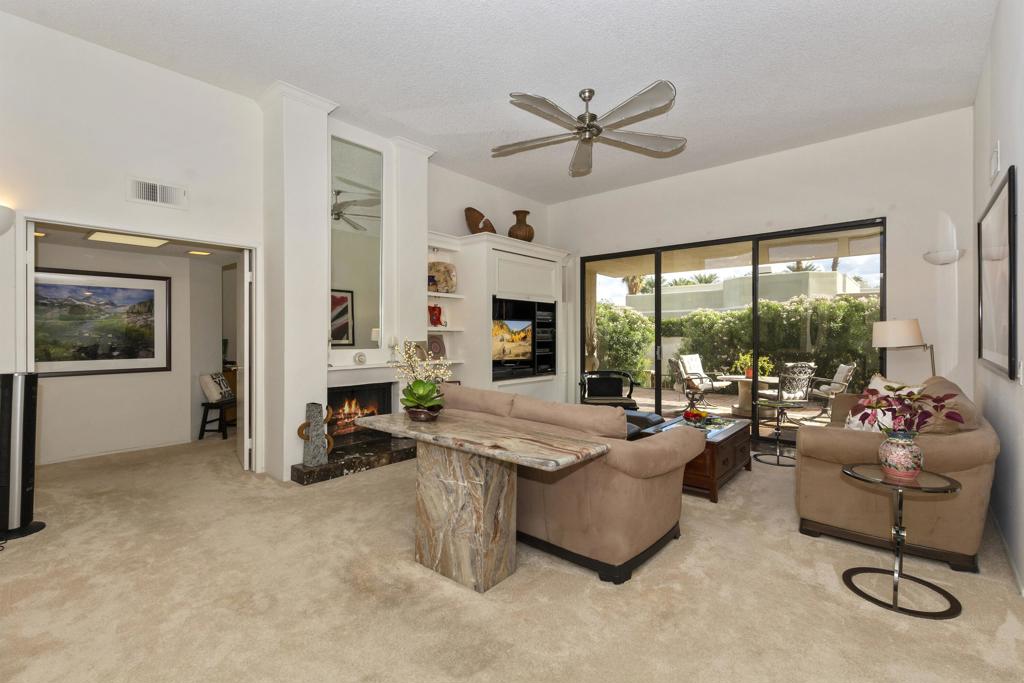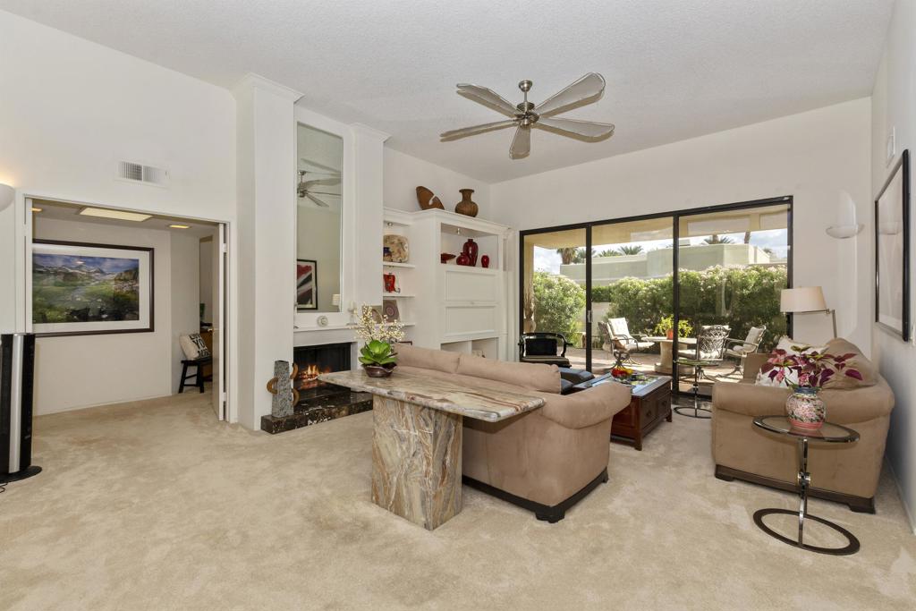 Welcome to Laguna de la Paz–a community where tranquility meets luxury. This beautifully appointed condo invites you to embrace south-facing views that overlook a sparkling pool, perfectly positioned for privacy. From your back patio, the majestic Santa Rosa Mountains provide a breathtaking backdrop you’ll never tire of. This home offers two spacious bedrooms, two baths, and a den that’s ready to become your third bedroom or the ultimate home office. The guest bath is designed for easy access from both the guest bedroom and den, offering added convenience for you and your guests. The interiors are a perfect blend of elegance and comfort, with marble, tile, and carpet flooring enhancing every room. Love to cook and entertain? You’ll appreciate the spacious kitchen with a casual dining area and a formal dining room ready for dinner parties. The living room is a showstopper, featuring a built-in entertainment center, fireplace, and a wet bar complete with mirrored glass shelving–perfect for showcasing your favorite spirits. From here, the seamless flow to the expansive patio transforms indoor-outdoor living into an everyday luxury. With BBQ access from the kitchen, master suite, and living room, you’ll enjoy hosting or relaxing while soaking up the mountain views. Best of all, this gem is being sold mostly furnished, offering you an easy transition to a lifestyle of comfort and convenience. Laguna de la Paz isn’t just a community–it’s a way of life. Come see for yourself.