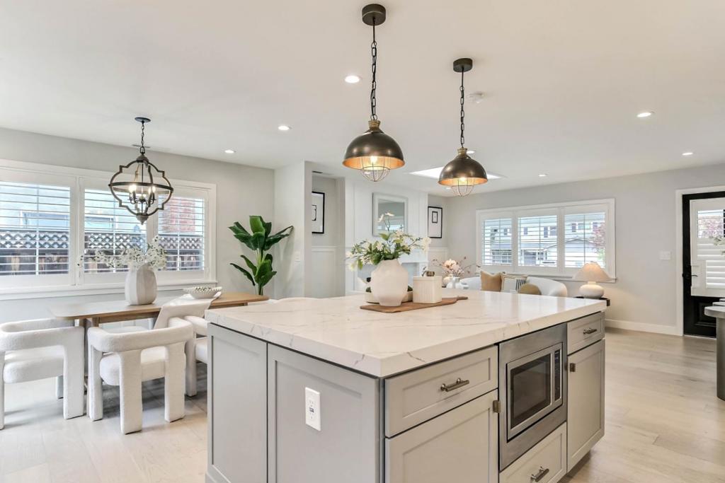 Newly renovated modern farmhouse located near Netflix, Apple Spaceship Campus, Westgate Center, & San Tomas Park, with access to Hwy 85, 280, & Lawrence Expy. Close to Forest Hill Elem., Rolling Hills Middle, & Westmont High. An open floor plan featuring skylights, & recessed lighting. Living area includes a fireplace with custom mantel & Carrara mosaic tile, Milgard dual-pane windows, plantation shutters, & Milgard double French doors. Kitchen includes a large central island, transitional two-tone cabinetry, white shaker-style perimeter cabinets, full-height tile backsplash, under-cabinet lighting, & stainless steel KitchenAid appliances (French-door refrigerator, stove, hood, microwave, dishwasher). Primary bedroom includes a vaulted ceiling, decorative 3D accent wall, large windows, & French door to backyard. Primary bath includes a freestanding soaking tub, frameless glass shower panel, rainfall shower head, two built-in shower niches, full-height textured & linear-pattern tile, skylight, recessed lighting, & integrated ventilation. Hallway bath includes patterned encaustic tile flooring, tub-shower combination, full-height tiled surround, built-in niche, modern vanity, & gold fixtures. Backyard includes a paver patio, level lawn, and raised planter beds.