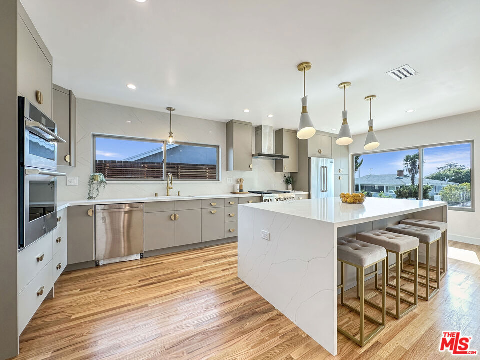 Welcome to this Sleek and Clean Mid-Century Pool home c. 1959 with undeniably timeless appeal, architecture and elegance. A recent appraisal has valued the home at $2.75 Million. Main residence features 2650 sf and 4bd 4 1/2ba. Private ADU above garage features 480 sf and 1bd1ba. This home showcases the most desired characteristics of a Mid-Century home with no expense spared. It has a clean minimalist aesthetic with gleaming original hardwood floors throughout. BELLDINNI MODERN interior and closet doors emphasize elegance and simplicity while providing superior performance, durability, and ease with MORELLI magnetic locks. A major emphasis on bringing the outdoors in and connecting to nature with large ANDERSON windows and sliding glass doors providing a scenic pool view and buckets of natural light. Open floorplan featuring two large family rooms, two fireplaces, dining area, expansive kitchen with 9ft island w/ beautiful waterfall edges, full wall backsplash, built-in bar area, and JENNAIR Appliances. All bedrooms have ensuite bathrooms for complete privacy. Luxurious primary ensuite with jetted bathtub and floor to ceiling tile. Primary bedroom features a walk-in closet and a full wall closet and all closets in the residence have custom closet organization systems. Sparkling pool, Central HVAC System, recess lighting, fresh exterior stucco, decorative lighting, private gated entry, and surveillance cameras!!! The pool has been resurfaced with updated plumbing and lights. There is a covered patio, faux grass area, and outdoor kitchen perfect for entertaining. The two- car garage has been finished with 240V outlets for electric car charging. Also save on electricity bills with environmentally friendly PAID SOLAR PANELS. There is a brand new ADU above the garage withe private entry, beautiful city views featuring 1bd1ba, full kitchen, laundry hookups, and mini split system. It’s perfect for a rental, in-law suite, or private office. Come see it while it is available!