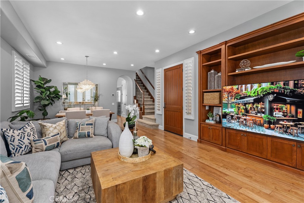 Gorgeous three-story beachside residence located blocks from the ocean and minutes from downtown Huntington Beach, offering convenient access to the Pier, Main Street dining, shopping, and entertainment. This beautifully designed home features 3 bedrooms, 3 full bathrooms, and 2 powder rooms with a spacious layout that blends modern finishes and coastal charm. The first level offers new hardwood floors with 9+ foot ceilings, abundant natural light, plantation shutters, and French doors opening to a private landscaped front patio, creating seamless indoor-outdoor living. The gourmet kitchen is appointed with a soapstone island, Calacatta marble countertops, SubZero and Viking stainless steel appliances, and a wine cooler, complemented by an elegant dining area and breakfast nook with bay window overlooking a side patio ideal for outdoor dining. First-floor amenities include a powder bathroom, laundry room, and direct access to the garage. The home is equipped with whole house water softening, app-accessible smart features including Lutron autonomous lighting, MyQ garage entry access, and central AC with Nest equipment for enhanced convenience and efficiency. The second level features a spacious family room with a dramatic double-height ceiling, fireplace, and expansive windows, along with a primary suite offering dual closets including a walk-in, a spa-style bathroom with jetted tub and separate shower, and French doors leading to a private balcony. Secondary bedrooms share a Jack-and-Jill bathroom, with an additional separate powder bathroom located in the hallway. The third level provides a generous multipurpose room with built-in shelving suitable for a home office, den, or additional living space, plus a full bathroom with shower and access to another private balcony. Located within a highly regarded school district, this home offers a rare opportunity for coastal living with various outdoor spaces, flexible living areas, and a prime Huntington Beach location.