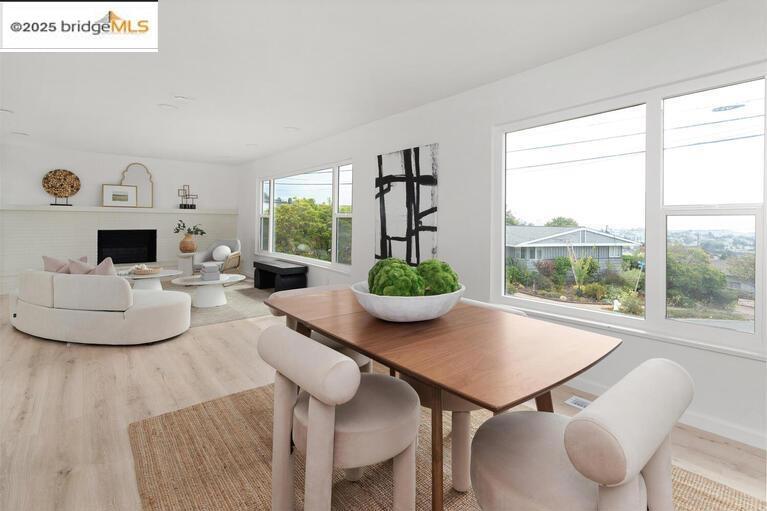Welcome to this beautifully updated 3-bedroom, 3-bath home with ++bonus space and panoramic views of San Francisco, the Bay, and two iconic bridges. Step inside and be instantly captivated by the sweeping vistas from the open-concept living and dining area, where blonde laminate floors, an inviting fireplace, and oversized picture windows create a warm, light-filled space perfect for relaxing or entertaining. The brand-new kitchen is a chef’s dream, featuring quartz countertops, a breakfast bar, soft-close cabinetry, a new range with island canopy hood, and a separate prep area. It flows seamlessly into the family room, which opens to a private covered patio —ideal for hosting gatherings or enjoying peaceful evenings outdoors. Upstairs, you’ll find three bedrooms, including a primary suite with a walk-in cedar closet and a modern ensuite bathroom. The two additional bedrooms share an updated hall bath with a new vanity, lighting, mirror, and a shower over tub. Downstairs, a private bedroom suite with its own entrance, cozy fireplace, and full bath offers a perfect setup for an in-law suite, bonus family room, or a dedicated home office. The charming front patio adds curb appeal and provides easy access to this versatile space.