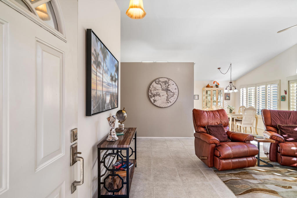 Looking for a desert home that truly fits your lifestyle? This inviting three-bedroom, two-bath residence is ideally situated within the interior of the Oasis Country Club, offering privacy, comfort, and an outstanding community. Vaulted ceilings create an immediate sense of openness, while tile flooring throughout the living room, dining area, kitchen, and hallways enhances the bright atmosphere.The kitchen is designed for both everyday living and entertaining, featuring bar seating and a pantry. The third bedroom, complete with a closet and window, is currently used as an office but easily functions as a true bedroom or den. The guest bedroom is generously sized, offers a walk-in closet, and provides direct access to the second full bath–ideal for visiting family and friends. The primary suite is a peaceful retreat with ample closet space and sliding doors that lead to a private courtyard patio, perfect for morning coffee or a secluded garden space. An attached garage provides room for your vehicle, the washer and dryer, and additional storage or a golf cart.Oasis Country Club is a member-owned community with an on-site HOA and an exceptional array of amenities, including 18 swimming pools and spas, an executive golf course with practice facilities, putting green, and an 18-hole putting course enjoyed by residents and guests alike. Additional offerings include tennis and pickleball courts, a clubhouse with formal dining and lounge, casual dining in the grill room, a pro shop, and a dedicated bark park. Mature landscaping and seasonal citrus trees further enhance the charm of the community.Conveniently located near major freeways, El Paseo, La Quinta, and everyday shopping, this clean and well-maintained home stands out with its flexible floor plan and desirable third bedroom. Opportunity is knocking–come experience the Oasis lifestyle for yourself.