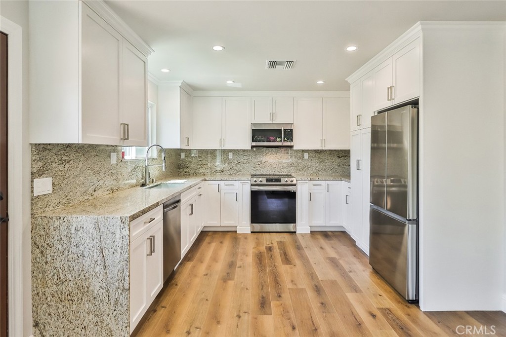 2 story newly constructed ADU. 3 bedroom 2 bath with 1200 square feet of living space. Gourmet kitchen with granite counter tops and stainless-steel appliances. Large living room. Recessed lighting throughout. All bedrooms upstairs, Tankless water heater, solar panels, Refrigerator, washer & dryer included.