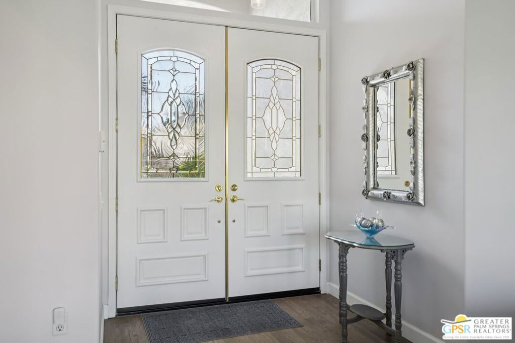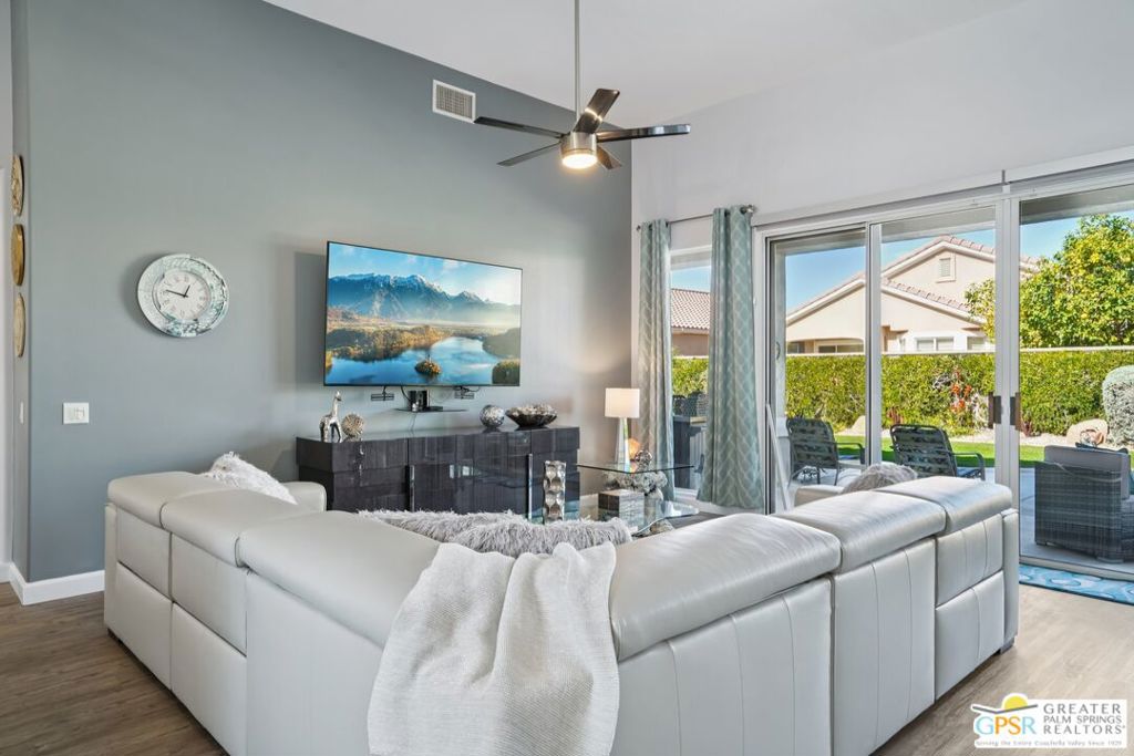 Set on a quiet street near the Sunset View Clubhouse, this upgraded 3 bedroom, 3 bath extended Monaco with extended garage offers over 2,500 sq ft of versatile desert living inside Del Webb Sun City Palm Desert, one of the country’s most sought after 55+ communities. The light filled great room opens to a private backyard with lawn, spa, and waterfall, creating a true indoor-outdoor retreat. The open kitchen and family room feature a large center island and casual dining area ideal for entertaining or everyday comfort. The primary suite includes a very spacious walk-in closet, large bathroom closet with plenty of storage, and beautiful spa-style shower. Two additional suites, each with their own private access, offer exceptional flexibility for guests, a home office, or income-producing casitas. Additional highlights include a laundry room, oversized two car garage, plus a dedicated golf cart garage. Residents enjoy access to two championship golf courses, resort-style pools, a modern fitness center, walking trails, clubhouses, dining, and endless social activities, all within a beautifully maintained, guard gated community. This is relaxed, resort-style desert living at its finest. Furnishings available outside of escrow