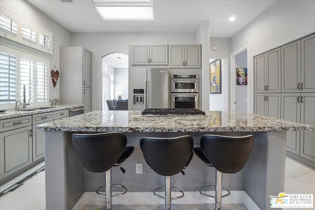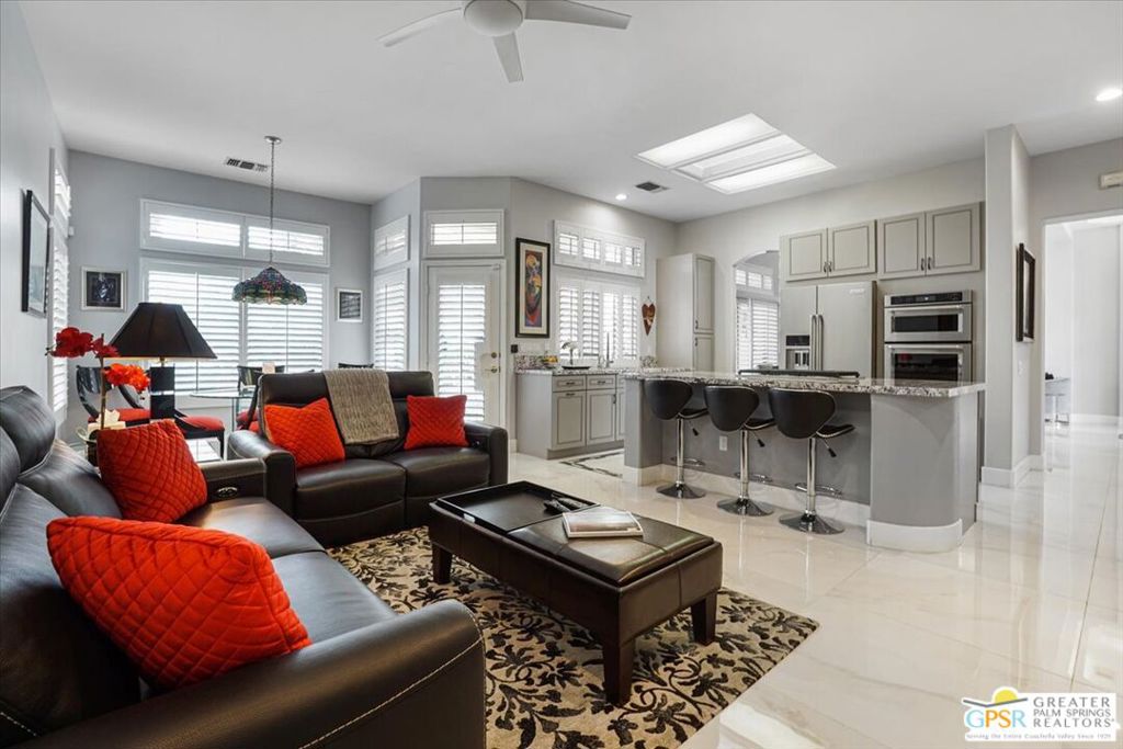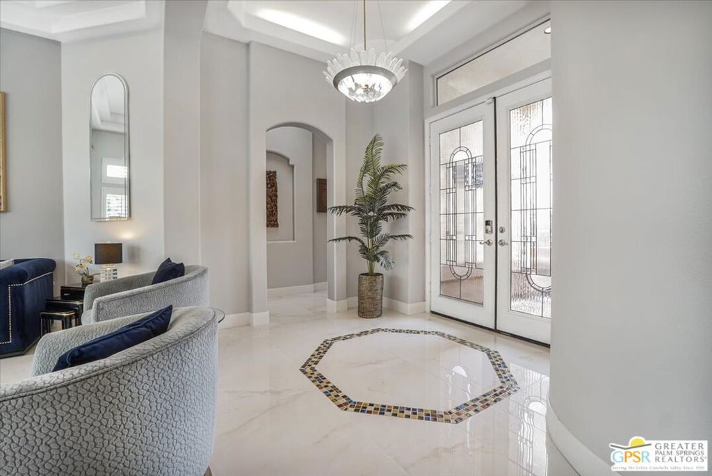 Tastefully Renovated with the Finest Materials. Completely Furnished including Art, Linens, and Kitchen Items. Enter the front Gated Walled Courtyard and be welcomed by the 8′ Leaded Glass Double Door Entryway. Once inside, it feels like the lobby of a grand hotel with a unique Chandelier and 12′ Coffered Ceilings. Flooring throughout consists of 20″ Glossy Porcelain Tile with glass and ceramic tile features . Beside the 12′ ceilings in Living Room, there are Tall 10′ ceilings in the other areas. Great flowing floorplan that has been improved to add additional approach to living area from Chef’s Kitchen. Cooktop has been incorporated into island. All countertops are granite. Double Self Cleaning Convection Oven. All kitchen appliances are high-end Kitchenaid. Abundant cabinetry and storage in kitchen and hallways. Kitchen is Bright and opens to Family Room. Tall windows with Shutters everywhere. Smart Floorplan features great separation of bedrooms. Master Suite and Guest Bedroom are on one side separated by long hallway. On the other side of the home, is the third bedroom. The master bath has double vanity with quartz counterop, an inviting claw foot tub and a separate large custom shower. Guest Bedrooms are also ensuite with Large custom tiled showers and vanities with quartz countertops. A separate powder room was added. Hot Water is supplied by Tankless Water Heater. Garage is Large enough to hold 2 cars and a golf cart. More concealed storage in garage. It has also been customized to conceal HVAC Equipment and Trash Cans. HVAC recently upgraded. Garage has custom expoxy floors. Rear covered patio features elegant patio furniture to thrill the most discerning buyer. The Rear Yard is a beauty to behold with artificial turf and a handsome water feature. . High Citrus trees and Stuccoed walls add to privacy. Many flowers and bougonvilla enhance space with color. Feel secure in this exceptional 24hr guard gated 55+Community. One of the best facilities in the desert. There are 2 amazing golf courses, a driving range, 20 Pickleball/tennis courts, 5 heated swimming pools, one inside pool, great restaurants, fitness centers, and 3 beautiful clubhouses. Never a dull moment with 80+ clubs. See additional documents for Complete Inventory.This is a MUST SEE !
