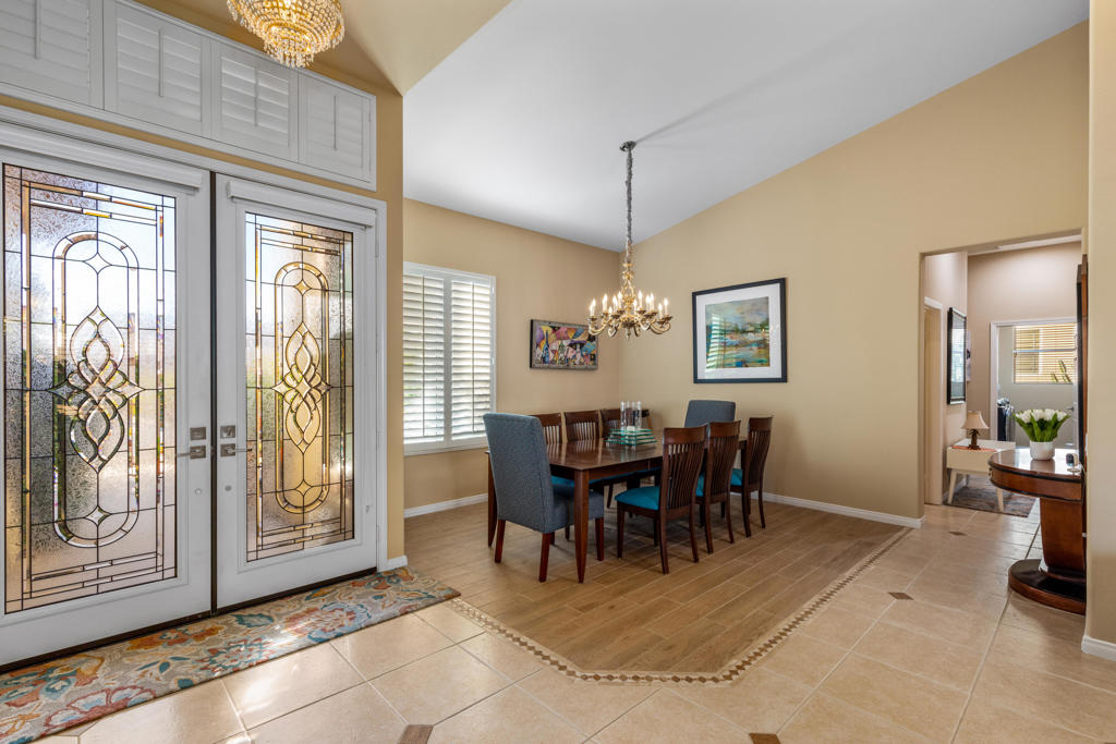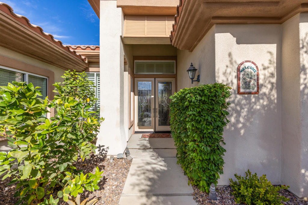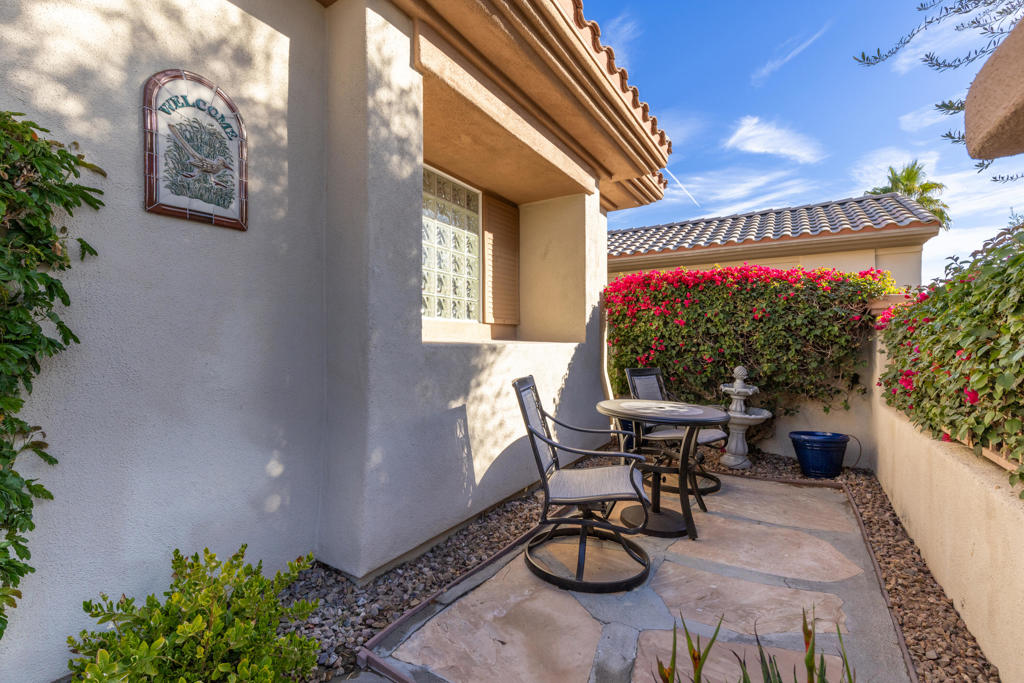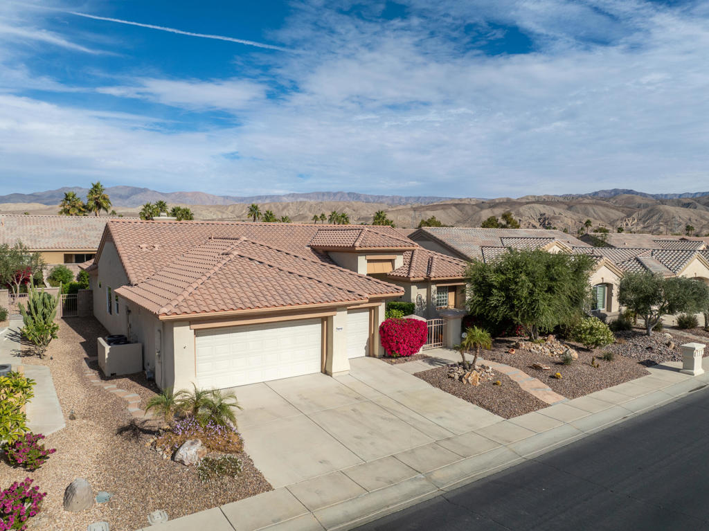PRICE REDUCTION, FURNISHED, BEAUTIFUL AND BRIGHT, this SAN REMO model has 3 bedrooms, 2.5 baths, fireplace in great room with custom built-in, all in pristine condition. Peek-a-boo mountain view can be seen from this room. Floors throughout this home are in wonderful condition. The kitchen has granite counters with upgraded stainless steel appliances and pantry. The primary bedroom has a bay window with an extra-large closet and bright large primary bathroom. There are two (2) additional bedrooms which can both fit a king-sized bed. The inside laundry room has upgraded washer/dryer, sink, counters, and cabinets. The garage has a newer epoxy floor, lots of storage cabinets, A/C mini split, extended golf cart garage. The very private backyard with higher wall is fantastic. It has newer synthetic grass for easy maintenance, lovely landscaping and room for a pool. This house is bright, inviting, and has wonderful curb appeal!