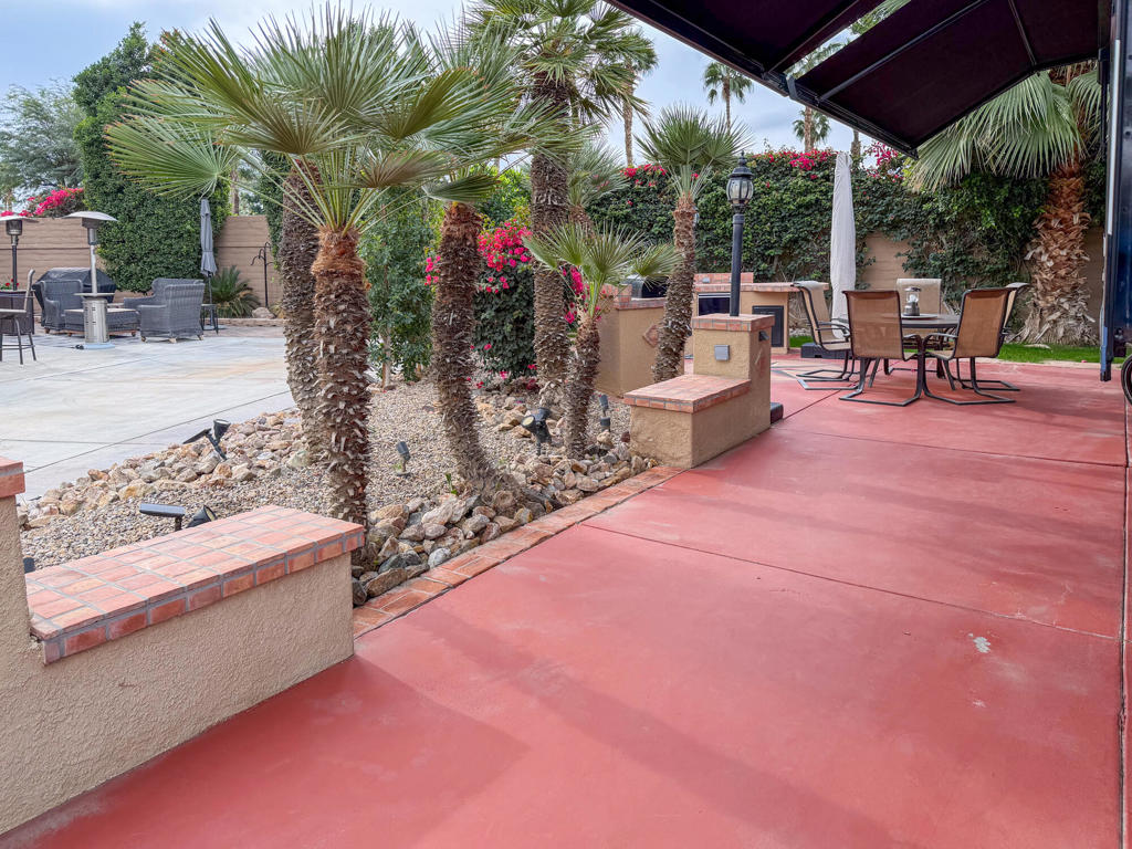 Outdoor Resort Indio is a class A only RV resort and this is an RV lot.RV Lot 91 is a spacious, pie-shaped luxury RV lot that widens toward the rear, offering a desirable north-facing orientation with beautiful morning sun and comfortable afternoon shade–perfect for relaxed outdoor living. The lot easily accommodates a 45-foot coach and offers flexibility for a potential casita, while its convenient location near a satellite pool with hot tub and laundry adds everyday convenience. A grass easement area at the rear of the lot is ideal for pets or can be converted to additional living space with pavers, enhancing both usability and value.Thoughtful landscaping with palms and a rock garden creates separation from neighboring lots, adding privacy as the lot opens up toward the back. The outdoor kitchen is well equipped with a gas BBQ, dual-bar sink, cooktop, water heater, and refrigerator/freezer, making it easy to entertain or unwind. With its widening layout and private rear setting, this lot offers an inviting balance of space, comfort, and flexibility at Outdoor Resort Indio.