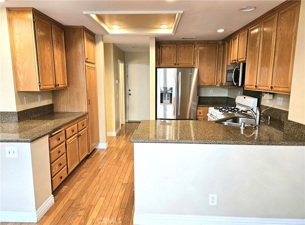 ** MUST SEE** Beautiful townhome featuring an open floor plan, volume ceilings, and a light, bright atmosphere including hardwood floors and an open kitchen with granite. Dual master suites upstairs, charming stone fireplace, and a private entertaining backyard. Enjoy resort-style amenities: pool, spa, and greenbelts. Close to Town Center shopping/dining and freeways!