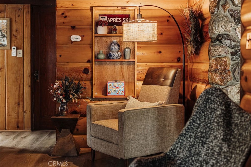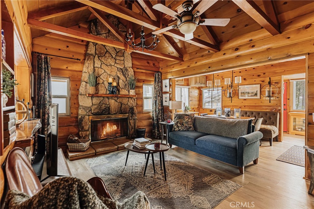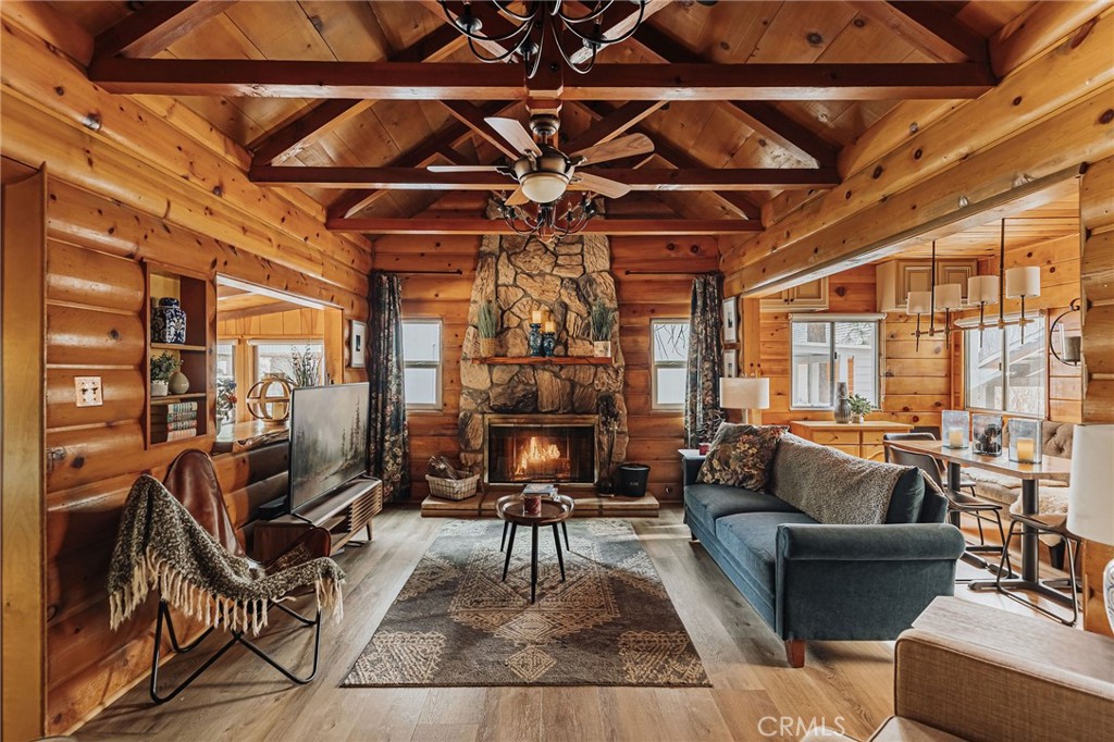 There’s a kind of magic you can only find in the mountains. And on this 10,000 sq ft street-to-street property in Big Bear’s beloved Peter Pan neighborhood, that magic lives on in a beautifully preserved 1930s Maltby-style cabin—where vintage character and quiet comfort meet under the pines. Step inside and you’re greeted by the warm glow of knotty wood walls and a grand rock fireplace, the kind that invites you to sink into a well-worn chair, turn down the noise of life, and get lost in a book. Large windows bathe the space in soft natural light, framing the lovely forest-like setting and adding to the cabin’s warm ambiance. Mornings begin with fresh coffee, sunlight streaming in, and a stroll through the spacious and heavily treed yard as blue jays call from the trees. The living space flows into a cozy dining nook with bench seating and ambient lighting, while the kitchen offers a balance of vintage charm and practical updates. Just off the kitchen, a retro-style bonus kitchenette—complete with original wood cabinets and a bold red door—adds both function and flair. Each room tells its own story, with curated vintage furnishings, layered textures, and designer details—from the wallpapered bedroom to the modern light fixtures. Come nightfall, grab your favorite beverage, cue up your favorite music, curl up by the fire, and just soak it all in. Upgrades include a mini-split A/C and heating system, solar shades, and a 7-person hot tub tucked beneath the stars. Outdoors, enjoy a hard-lined gas grill, plus three storage sheds for all your mountain toys. There’s room to park an RV or boat. The adjacent lot, included in the sale, opens the door to expansion, added privacy, or simply the joy of extra space. With the National Forest just up the street, you’re perfectly positioned for year-round adventure—from hikes to snowy afternoons by the fire. This isn’t just a cabin. It’s a place to gather, to rest, and to write the next chapter of your story.