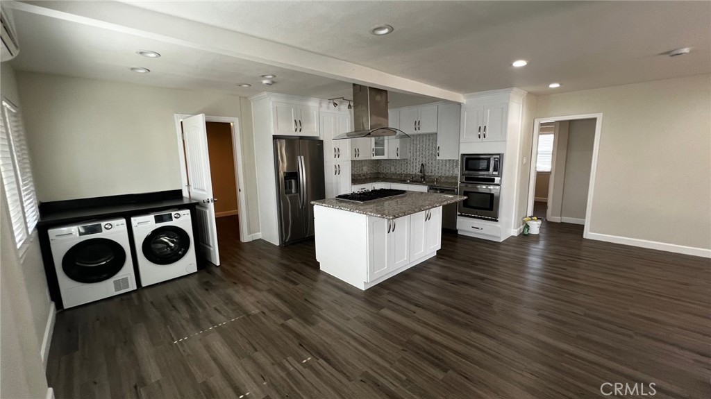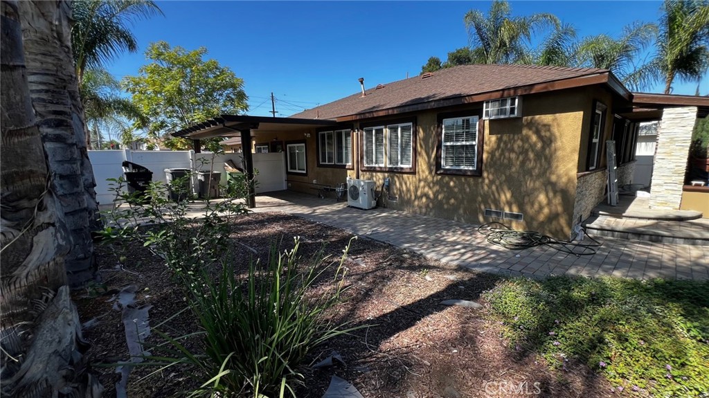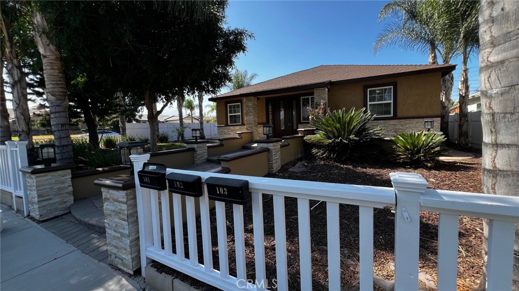 This is a warm real estate rental listing with a 4-bedroom, 2-bathroom home that highlights its key features: in-home laundry, a recently remodeled bathroom, abundant natural light, and a spacious kitchen island with a burner perfect for hosting family gatherings. It also has a white picked fence with large palm trees surrounding the home.