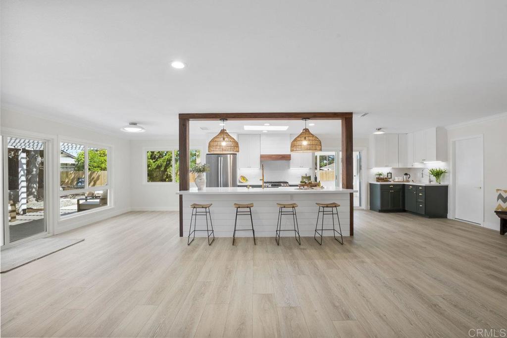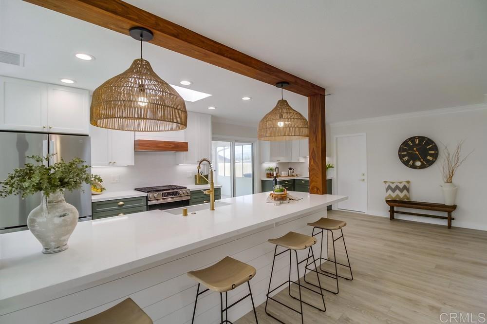 Stunningly remodeled, this 3-bedroom, 2-bath home offers the perfect blend of modern elegance and everyday comfort. Step into an open-concept great room – ideal for entertaining guests or enjoying quality family time. At the heart of the home is a beautifully designed kitchen featuring sleek countertops, all-new modern appliances, an oversized quartz island with breakfast bar, an inviting dining area, and a coffee/beverage bar with sink – all seamlessly connected to the living space. Every detail has been thoughtfully upgraded, including new luxury vinyl plank flooring, plush carpeting, fully remodeled bathrooms with the primary bath having a curb-less shower. Additional enhancements include new interior doors & windows (excluding the sunroom), a new A/C system, and a new roof. Enjoy outdoor living under newly installed patio covers – perfect for dining, entertaining, or simply relaxing. The sunroom, filled with natural light and equipped with a ceiling fan, offers a retreat for unwinding. A spacious 2-car garage with cabinets and a sink completes this exceptional home. List of recent upgrades: New roof with warranty, skylights and new rain gutters New windows (except sunroom) and sliding glass doors with custom trim New AC condenser and AC chiller with new centrally located large air intake All new bathrooms with high end vanities, high end tile and new fixtures Curb-less shower in primary bathroom and new bathtub in hall bathroom New mirrors, toilets and lighting in both bathrooms New designer kitchen with walnut column accents, farmhouse sink, beverage center, quartz counter tops and large island New refrigerator, gas stove and dishwasher New designer lighting in kitchen New interior shaker style doors and jambs with matching shaker trim New waterproof LVP flooring and cushy carpet with shaker style baseboard New lighting fixtures in bedrooms and bathrooms Updated crown molding Entire home was painted inside and out New custom patio covers New drip system on back bank Extensive drainage system in backyard Low maintenance front yard with drip system Previously used Sprinkler system is still in place