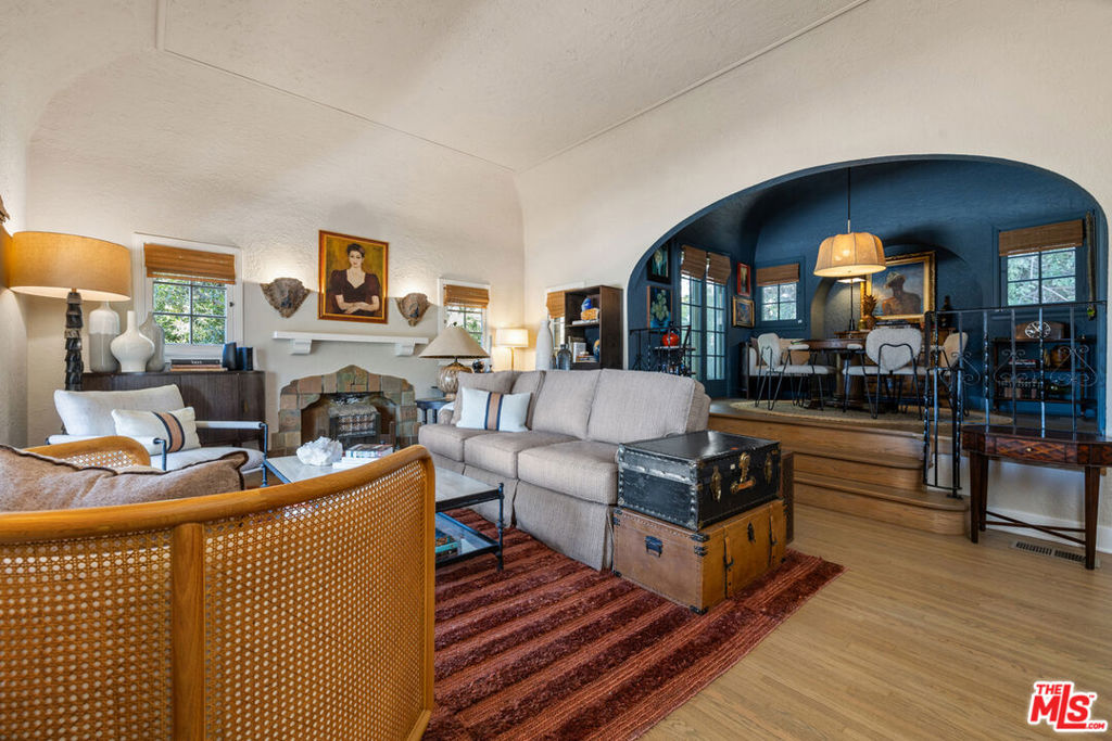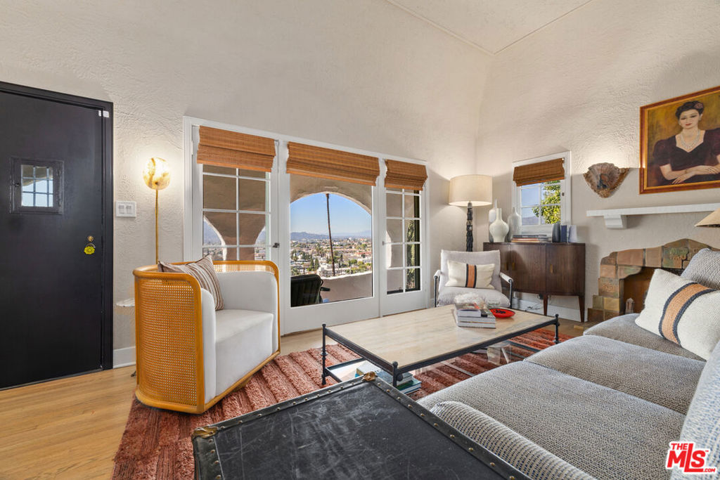 Perched on Adams Hill with panoramic city and mountain views, this 1925 architecturally intact residence was restored by an award-winning historic preservationist/designer, preserving original character with modern comfort. A sweeping stone staircase leads to an elevated front porch loggia with breathtaking views. Inside, tiered living spaces feature an expansive living room with original barrel ceiling, refinished oak floors and tile fireplace, and a barrel-ceiling dining room. The primary suite includes a bedroom opening to a Juliet balcony, adjacent office/sitting room, and rare original 13×6 walk-in closet. The original tiled bathroom retains its rare period lavender palette with tasteful modern upgrades. The updated kitchen boasts a 36″ professional range, new appliances and a stunning breakfast nook. Central air and heat are discreetly integrated. A large backyard and two-story garage with mezzanine offer versatility, including ADU potential. This is a historically grounded hillside residence defined by elevation, proportion and craftsmanship.